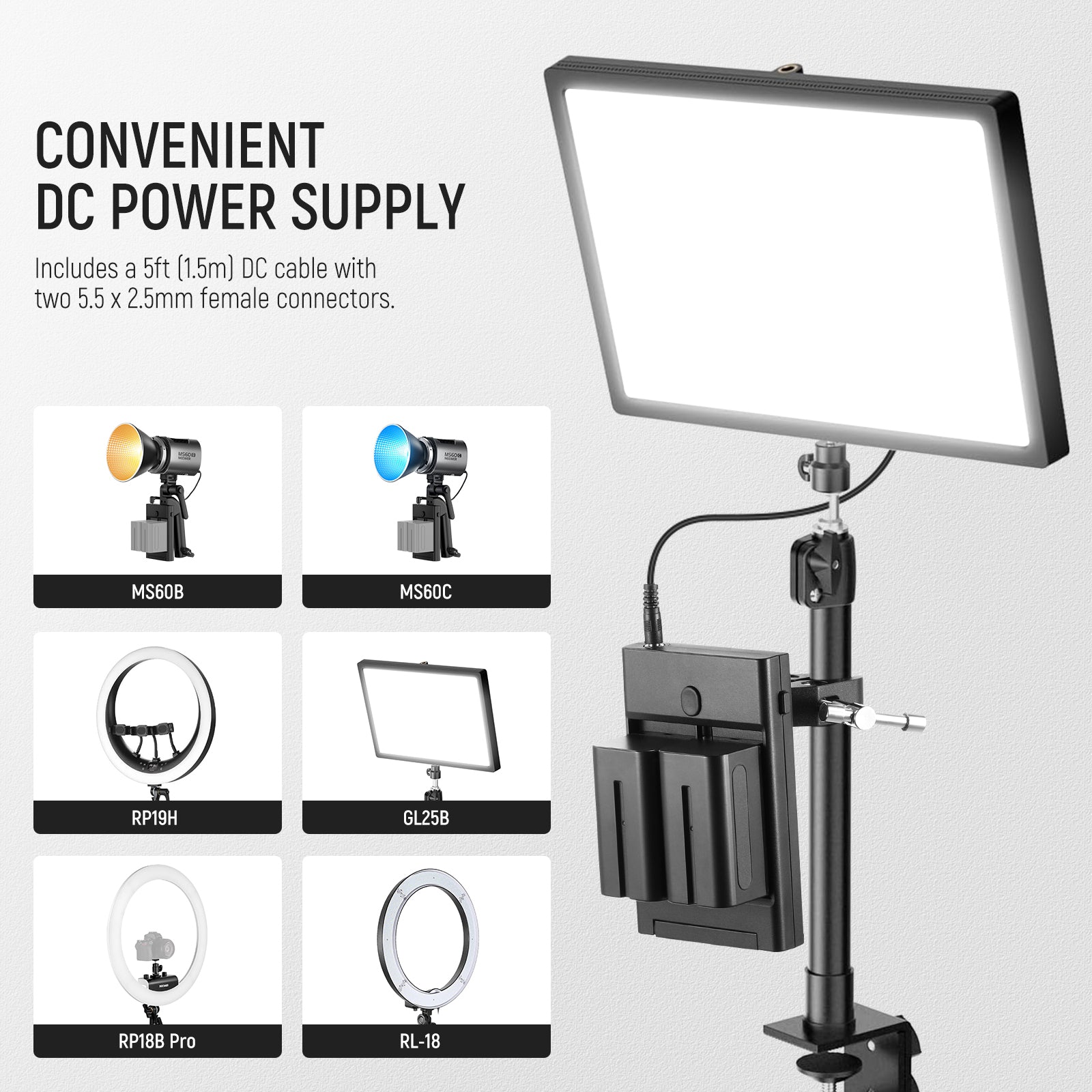 - Convenient DC Power Supply- Also includes a 5ft (1.5m) DC cable with two 5.5x2.5mm female connectors. It helps you connect the battery plate to a studio LED video light for power supply and allows you to move the light everywhere, compatible with Aputure AL-M9 compatible with Godox SL-60W compatible with ZHIYUN Molus G60 60W Pocket COB Light, and NEEWER 18 inch ring light MS60B MS60C 660 RGB660 and more