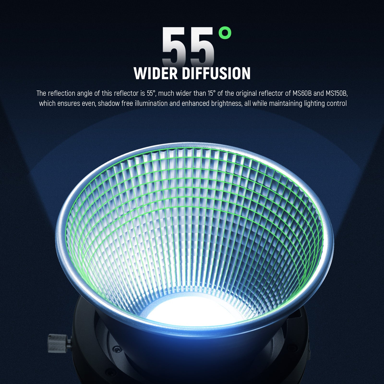 - 55° Wider Diffusion for Maximum Light Output- With a textured silver interior, the photography reflector can maximize the light source with a neutral color rendition. The reflection angle of this reflector is 55°, much wider than 15° of the original reflector of MS60B and MS150B, which ensures even, shadow free illumination and enhanced brightness, all while maintaining lighting control