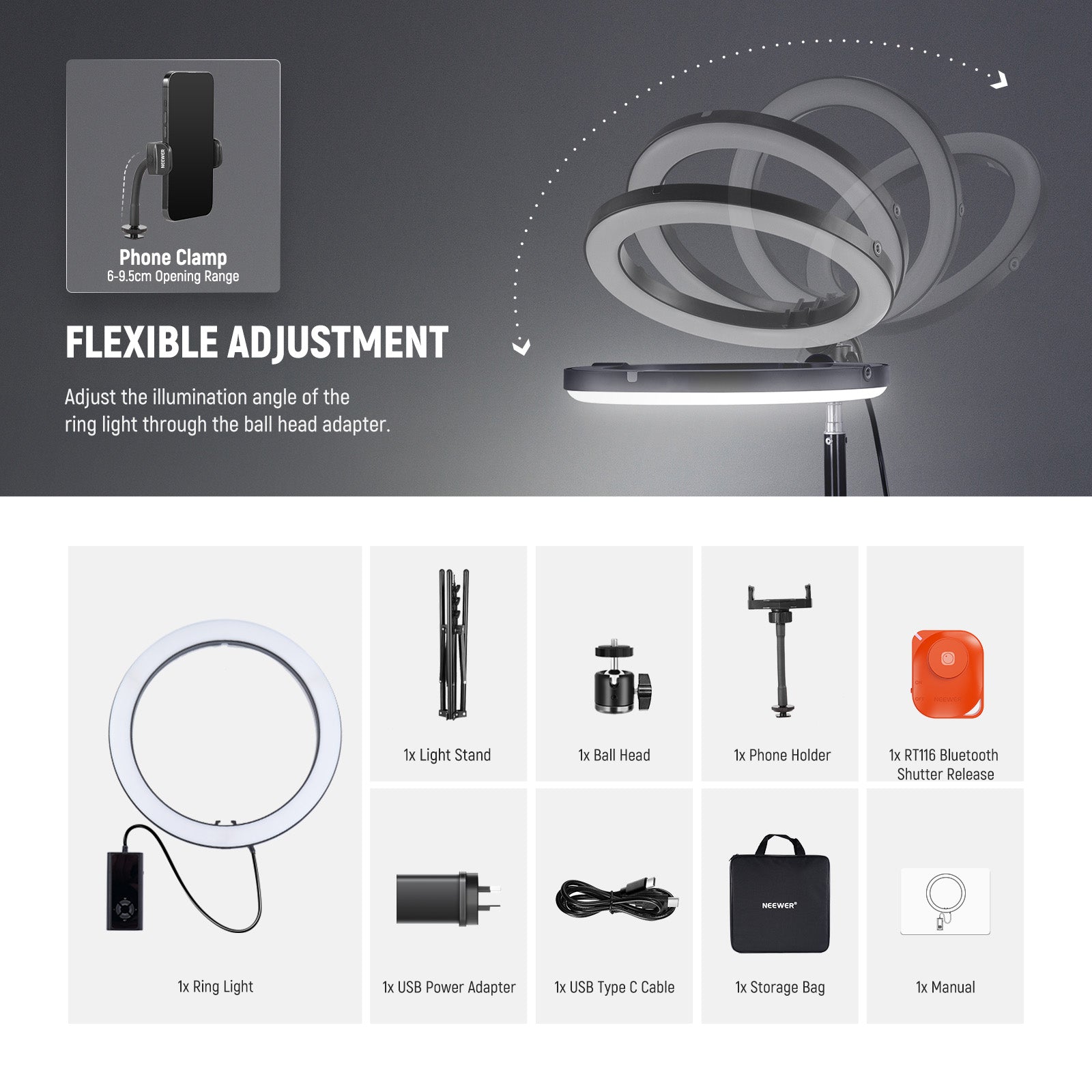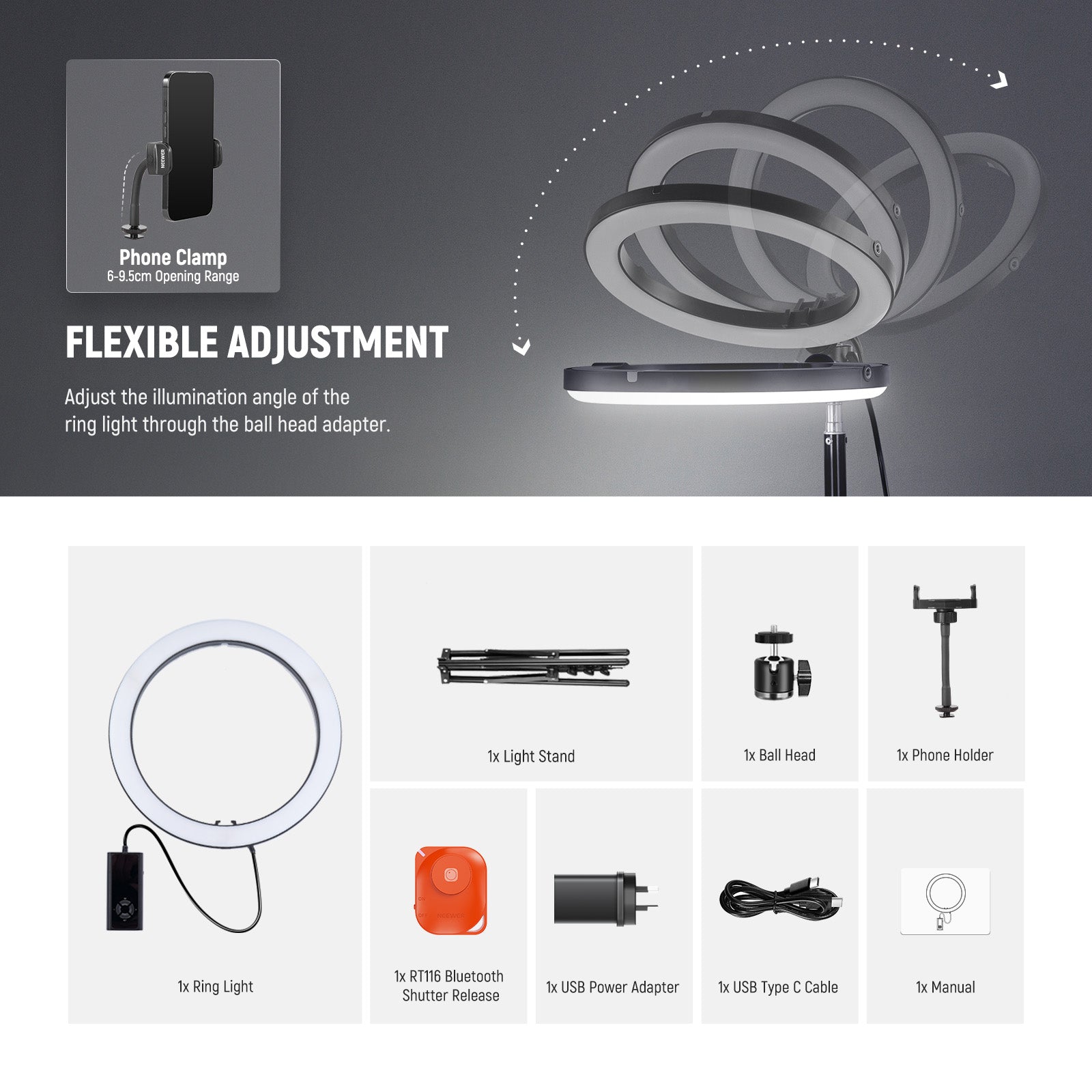 - USB Type C PD Input & Shutter Release- Efficiently powered using the included USB C PD charger and USB C cable, the big RGB circle ring light operates stably to ensure uninterrupted shooting sessions. An RT116 Bluetooth shutter release is contained for convenient remote control, allowing you to film, take photos or start/stop video recording from a distance, ideal standing lighting gear for selfies, group shots, or long exposure photography and videography