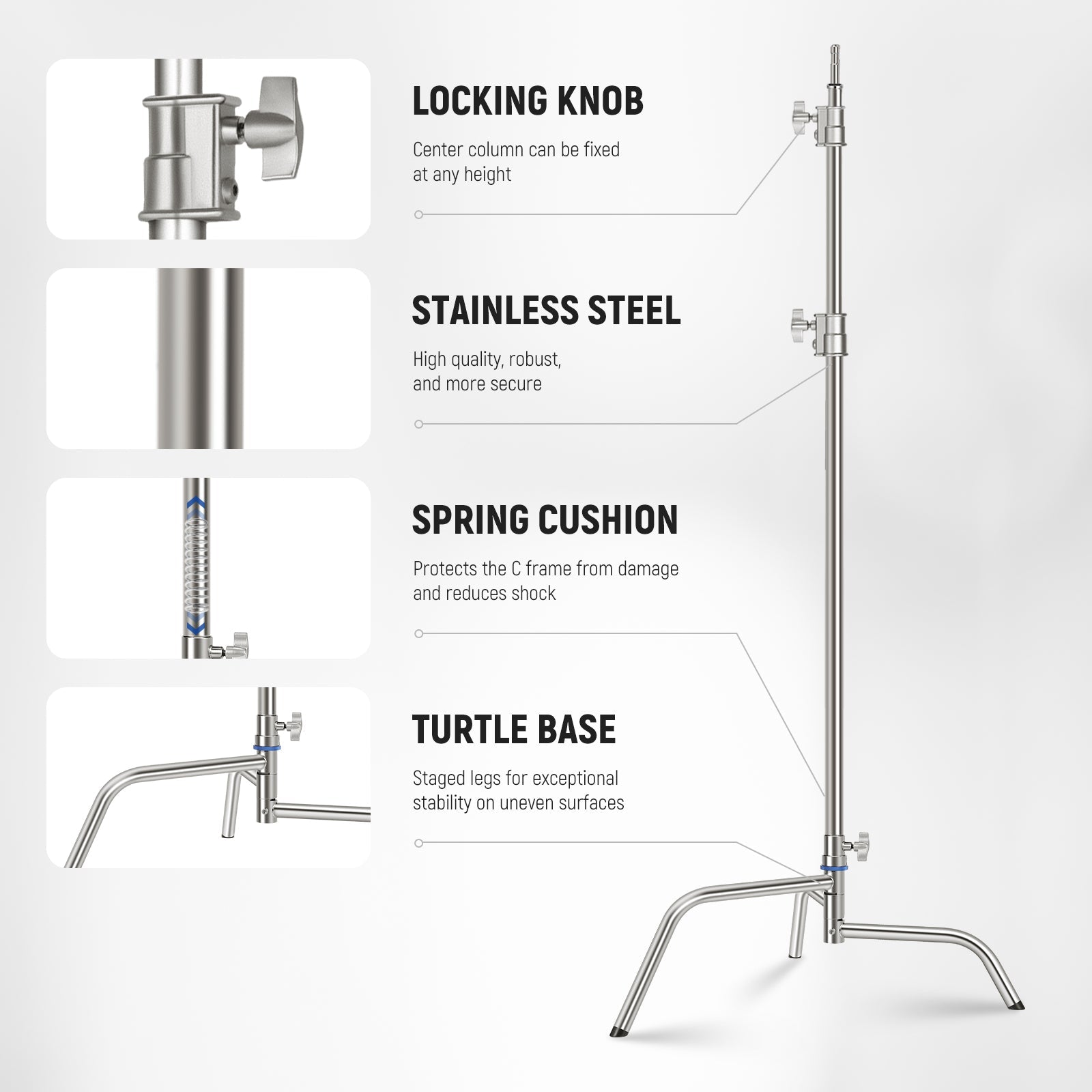 - Adjustable Height- Our C stand can be adjusted in height from 5ft (153cm) to 10.5ft (320cm), accommodating different lighting needs. The center stand is equipped with a built in buffer spring to reduce the impact of sudden drops of the installed equipment and protect the equipment when adjusting the height