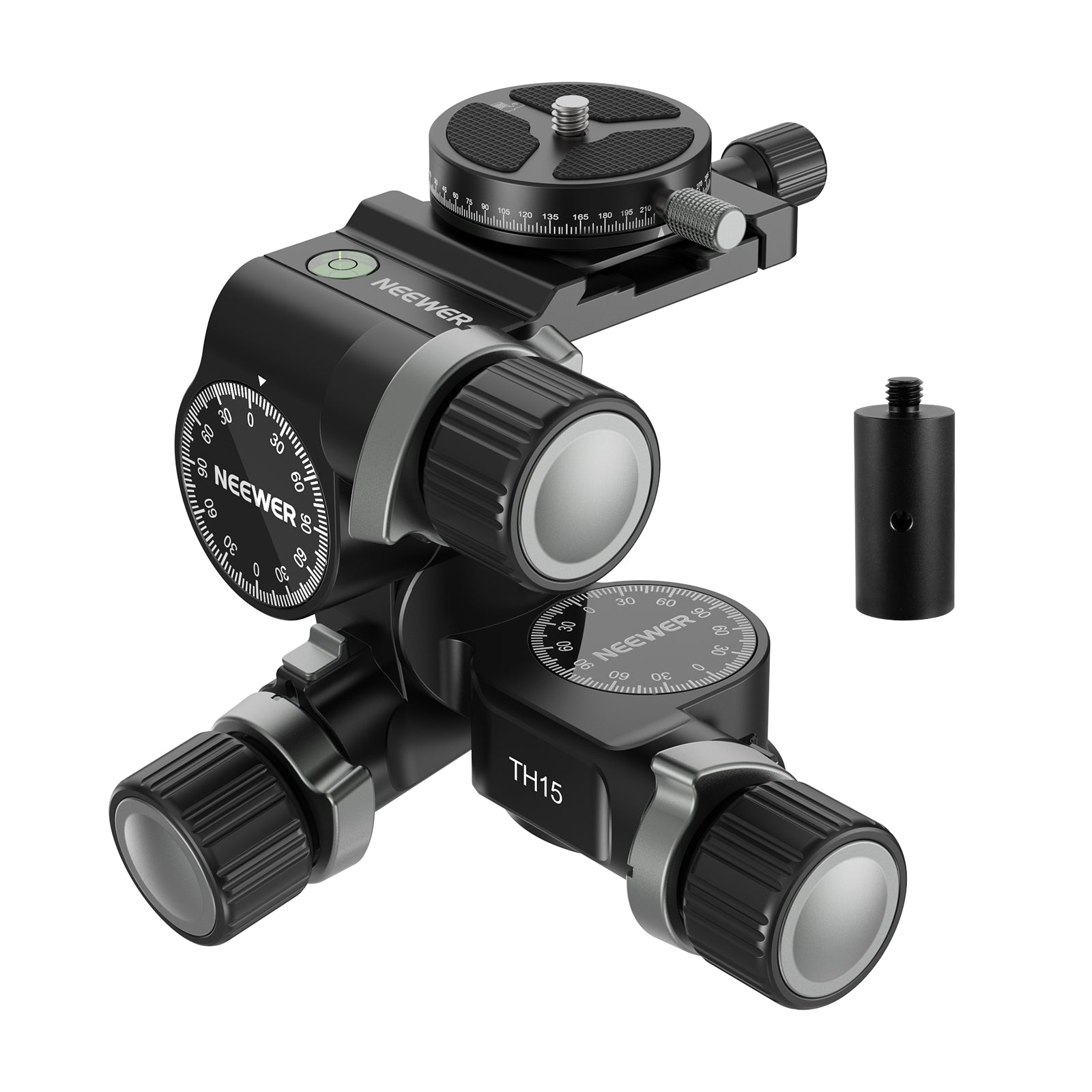 - 3 Axis Pan & Tilt Tripod Head for Efficient Positioning- NEEWER TH15 3 Way Geared Head offers 3 individual positions: -45°-90° frontal tilt, -90°-90° lateral tilt, and 360° pan. It features damping friction control and counterbalance for seamless and comfortable camera positioning. Two bubble levels help you with accurate leveling and always keep the camera straight