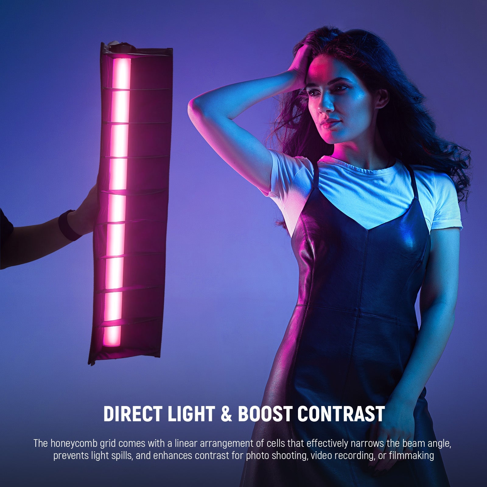 - Direct Light & Boost Contrast- The honeycomb grid comes with a linear arrangement of cells that effectively narrows the beam angle, prevents light spills, and enhances contrast for photo shooting, video recording, or filmmaking