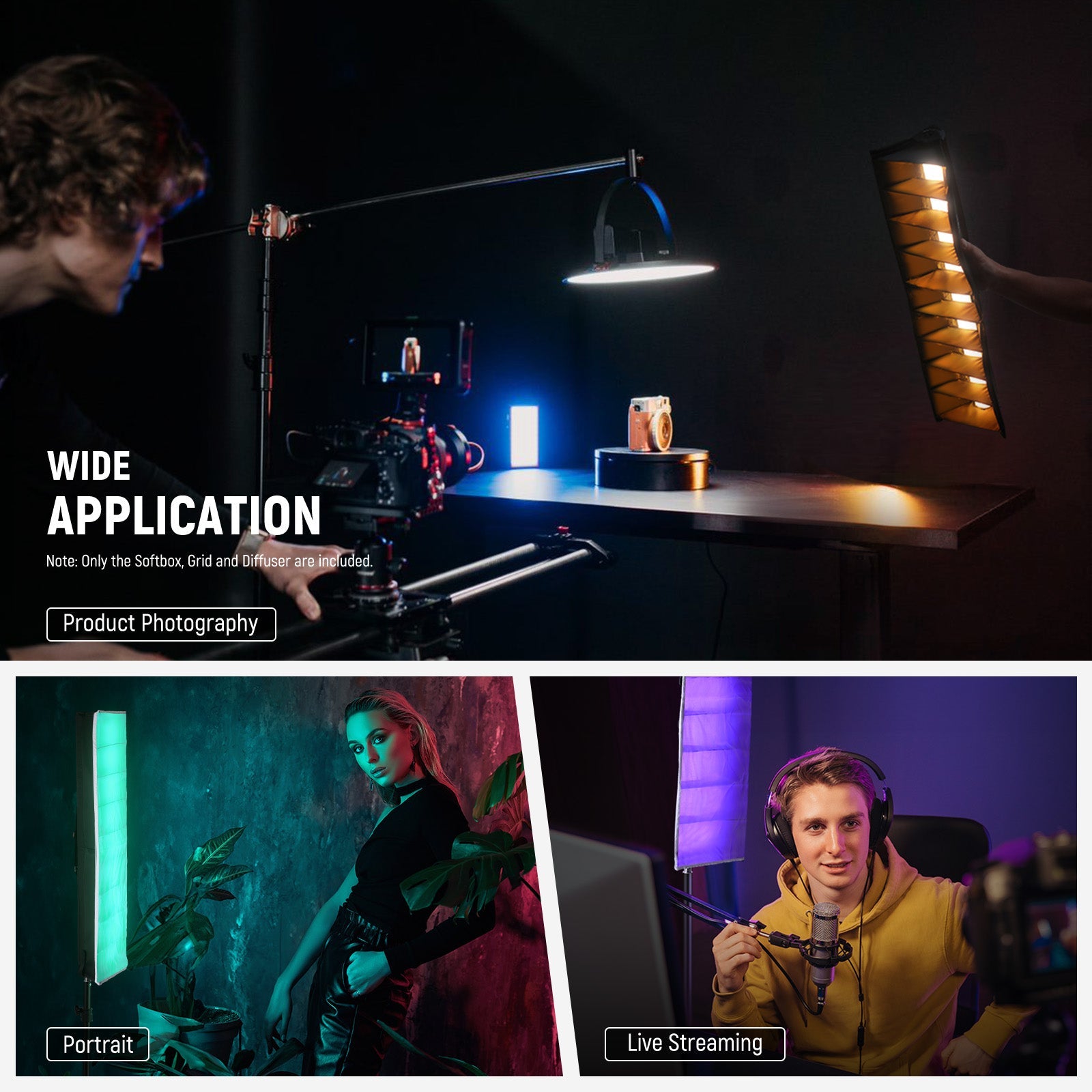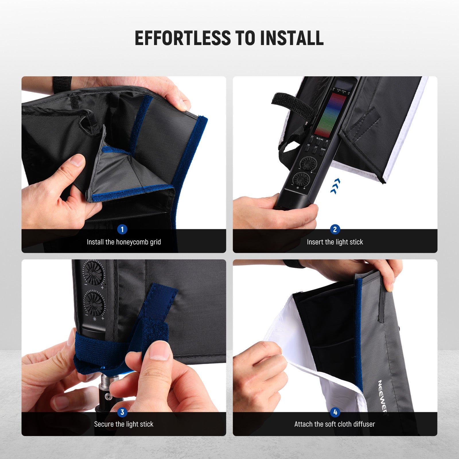- Quick & Secure Setup with Touch Fasteners- Insert the TL60 tube light into the dedicated pocket on the softbox, and secure it with touch fasteners on both sides to prevent slipping. Easily attach the grid and diffuser via touch fasteners; the detachable design allows for convenient folding and storage with the included pouch