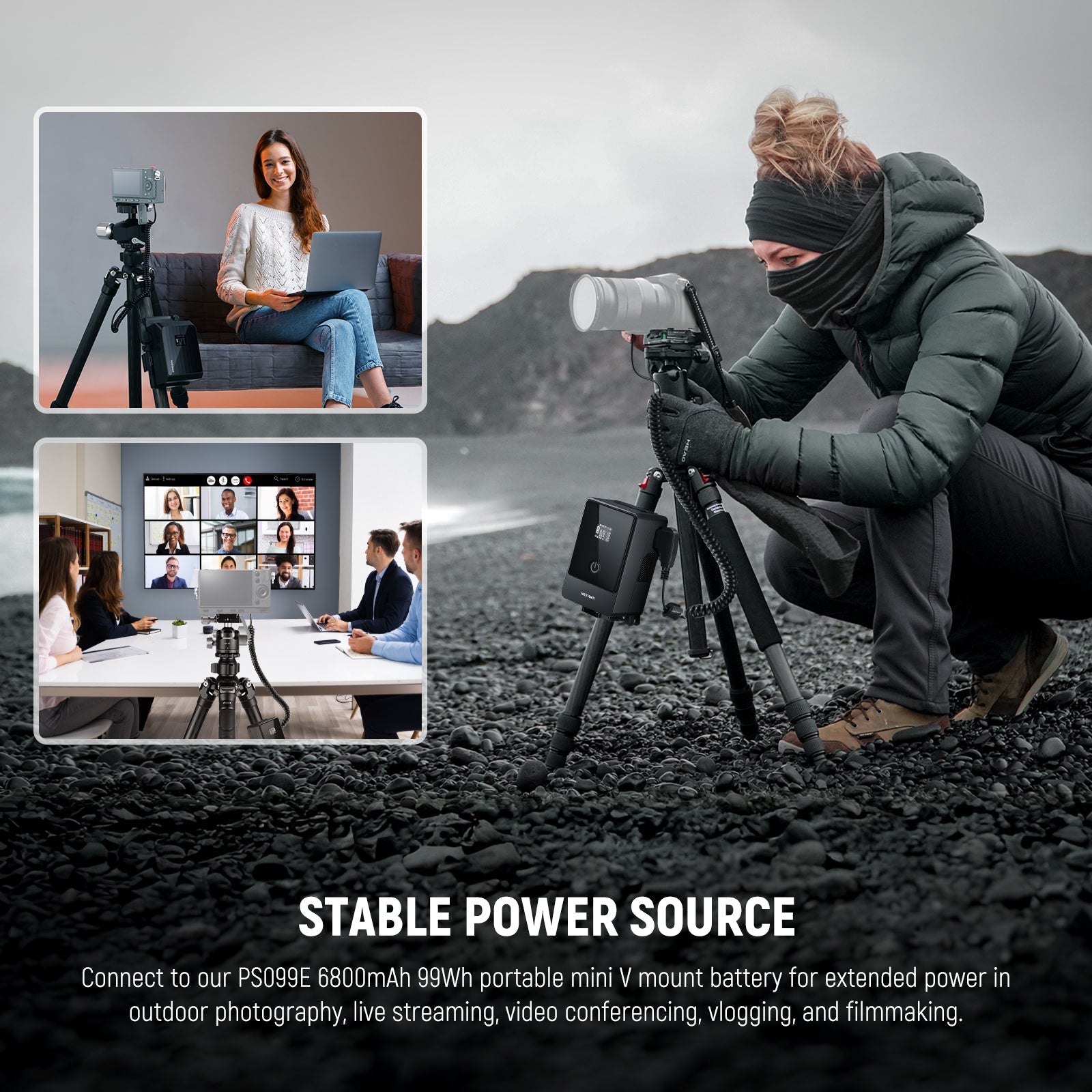 - Stable Power for Longer, Safer Footage- Say farewell to cable failures and safeguard your critical footage. Our intelligent chip ensures a constant and stable power supply for your creation. Connect to our PS099E 6800mAh 99Wh portable mini V mount battery for extended power in outdoor photography, live streaming, video conferencing, vlogging, and filmmaking