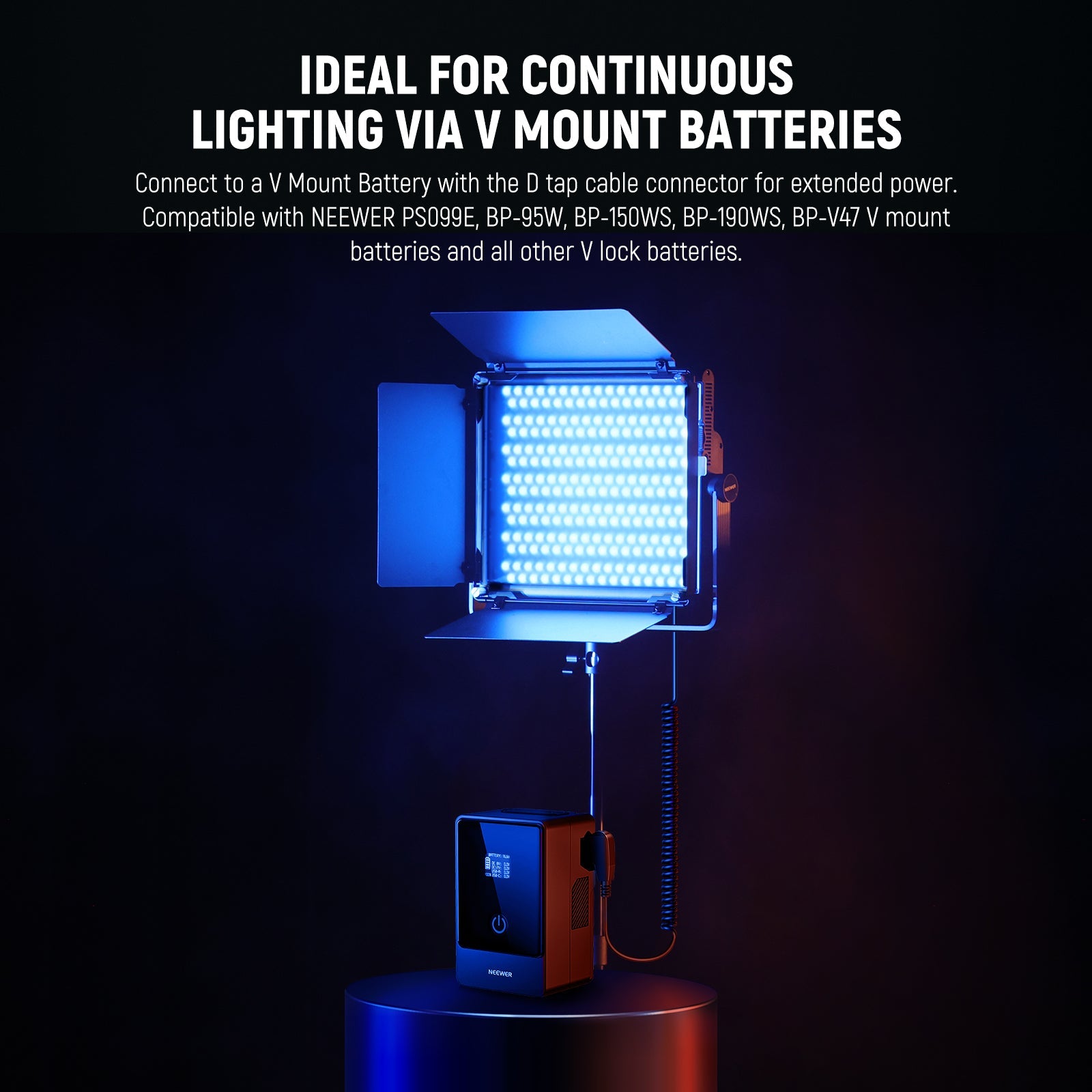 - Ideal for Continuous Lighting Via V Mount Batteries- With a D tap cable connector, it can work with NEEWER PS099E, BP-95W, BP-150WS, BP-190WS, BP-V47 V mount batteries and all other V lock batteries. Compatible with SmallRig v mount battery Series, compatible with Sony BP-U65 BP-U68 BP-U100 BP-U90 V mount batteries
