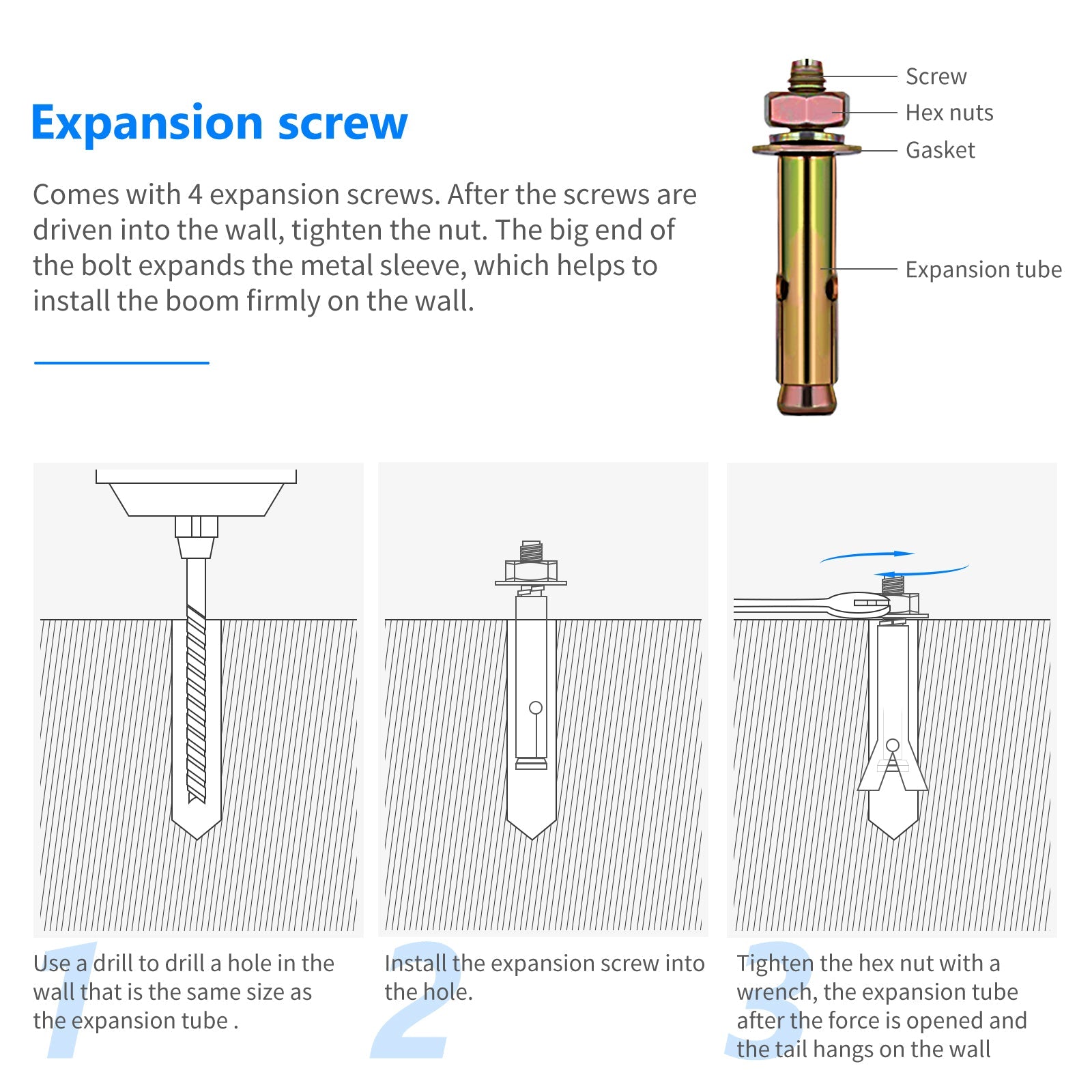 - Comes with 4 pieces of expansion screws, helping mount the boom arm on the wall much more solidly.