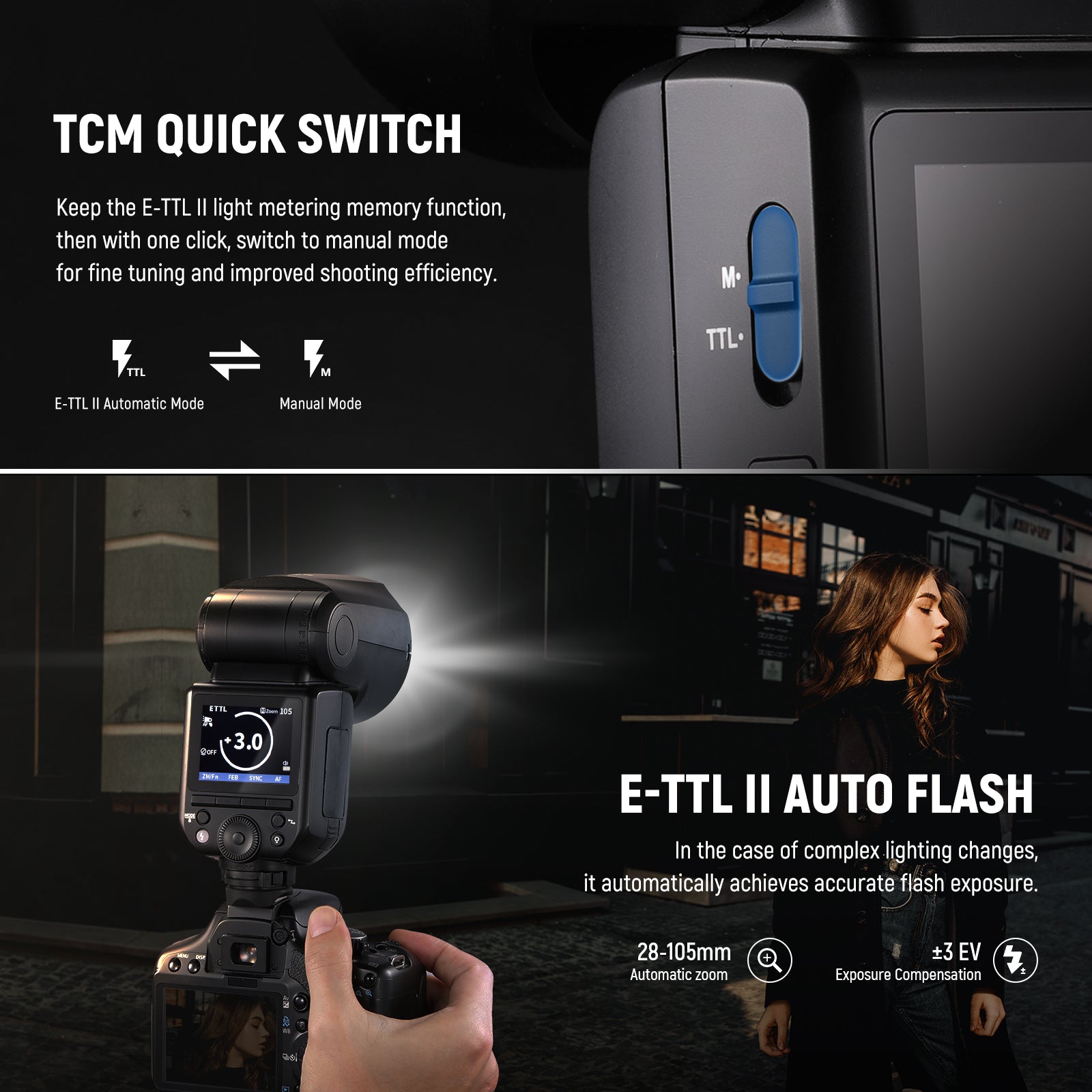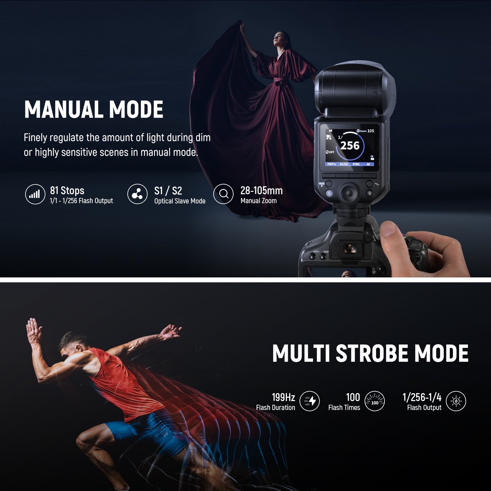 - Enhanced UI & Instant TTL/M Mode Switch- The NEEWER Z2-C speedlight now comes with an improved UI display and a quick TTL to manual flash mode switch via the TCM side key. It offers automatic metering or manual 1/1-1/256 dimming and adapts to focal lengths from 28mm to 105mm. Also supports Multi Strobe mode, 1/8000s high speed sync, front/rear curtain sync, FEC/FEB/FEL (flash exposure compensation/bracketing/lock), S1/S2 optical slave modes, etc