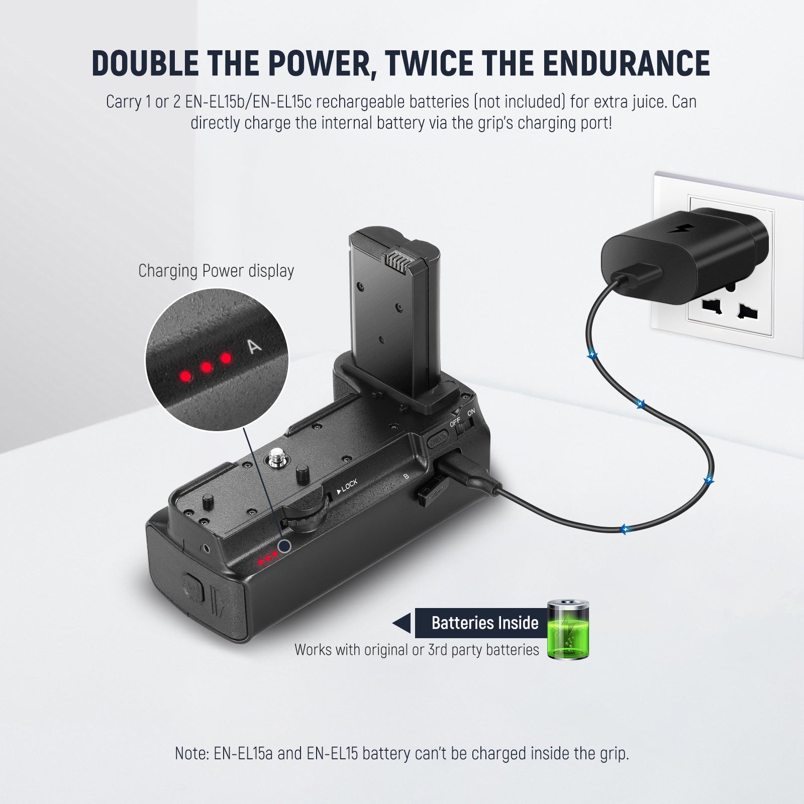 - Extended Battery Life- This battery grip offers enough space to hold two EN-EL15b or EN-EL15c batteries simultaneously to greatly extend battery life. Also comes with USB Type C port to charge the inserted batteries via USB cable. It saves the trouble of changing camera battery all the time, well suited for time elapse video recording, and long hour video filming (Note: EN-EL15a and EN-EL15 battery can't be charged inside the grip)