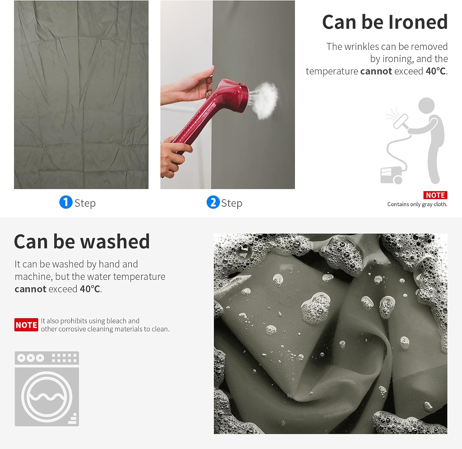 - The temperature of washing and ironing should not exceed 40℃.