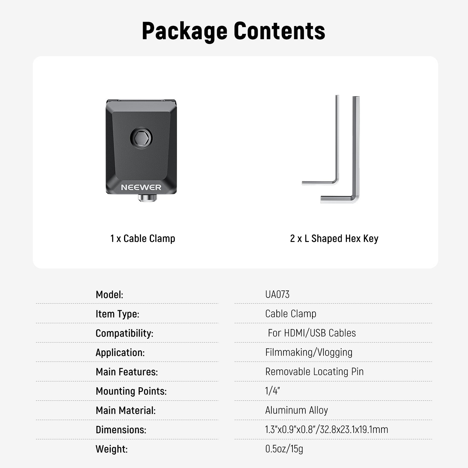 • Universal 1/4" Mounting Screw- With a 1/4" screw, the cable clamp can firmly attach to a camera cage, L plate, baseplate, video rig, and phone cage stabilizer with an L shaped hex key