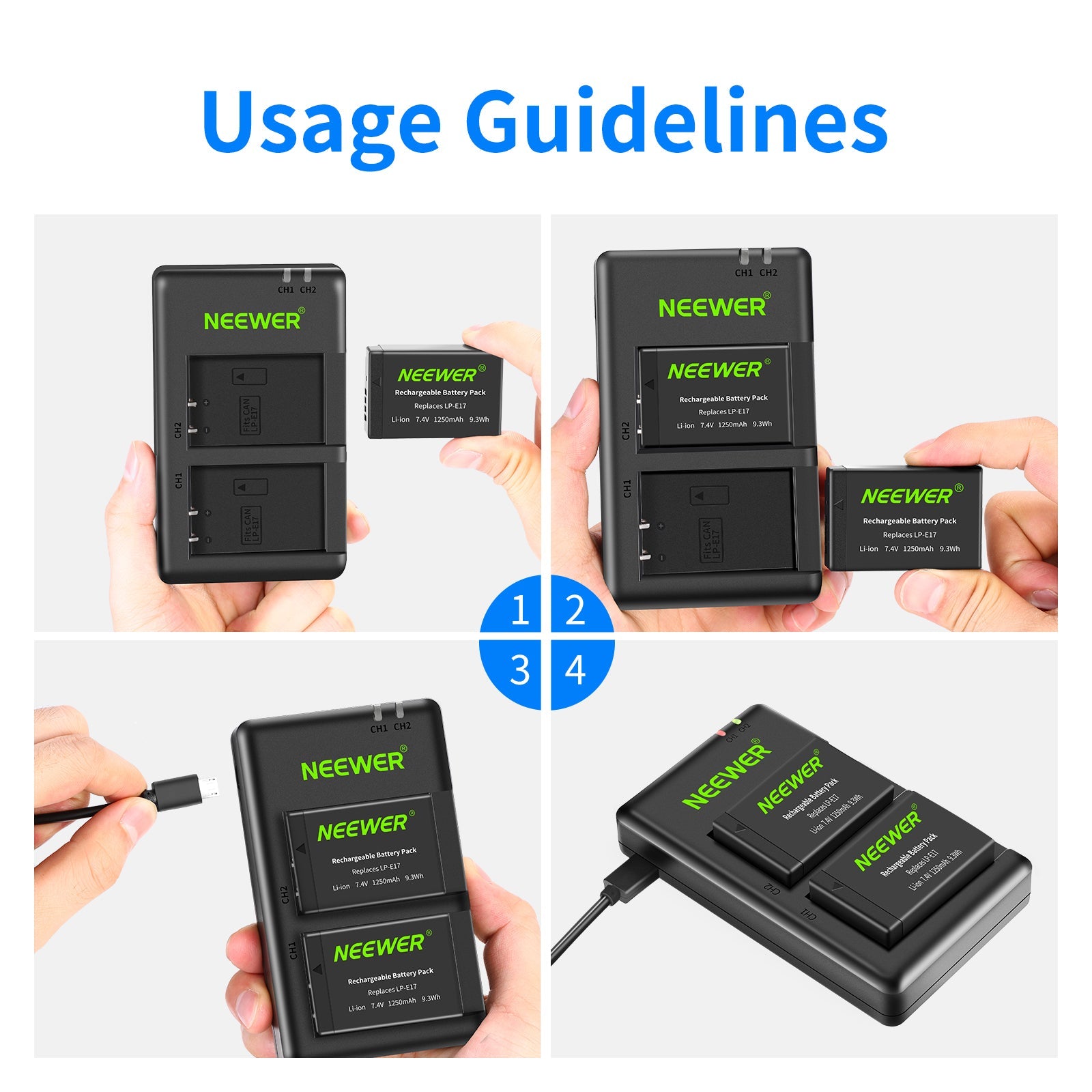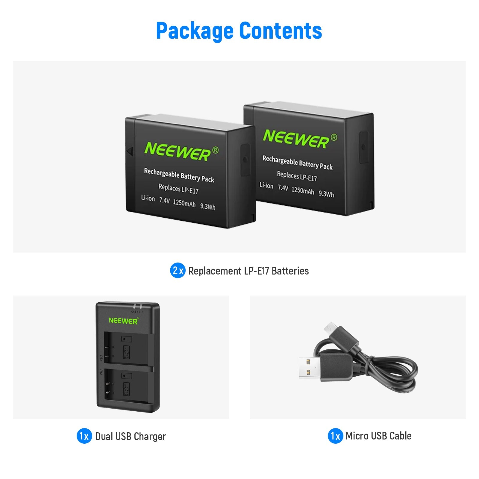 - COMPATIBILITY: 2 Packs 7.4V 1250mAh LP-E17 Replacement Batteries(Not fully decode) and a Dual USB Charger; Works the same as the original but not compatible with original camera charger or battery grip