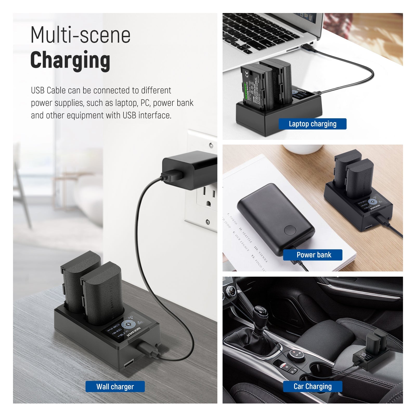 - Sufficient Battery Power- The LP-E6NH battery charger set gives more battery power for on location photography. Two 2250mAh rechargeable batteries provide longer battery life and help you take more photos and videos. NOTE: For optimal battery longevity, please fully charge the battery before first use