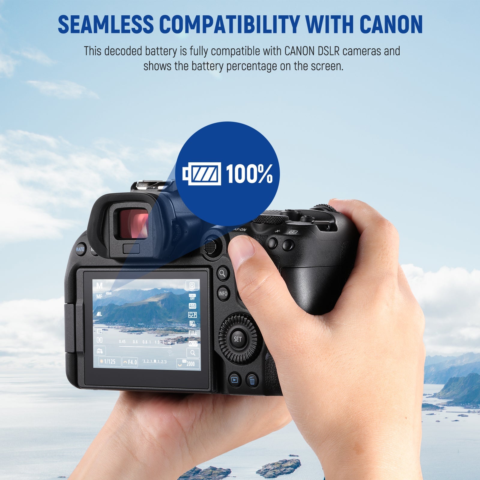 - Sufficient Battery Power- Two 2000mAh LP-E6/E6N rechargeable batteries offer sufficient battery power for photographers, vloggers, and filmmakers who engage in outdoor creation and help them capture every moment that is too precious to miss