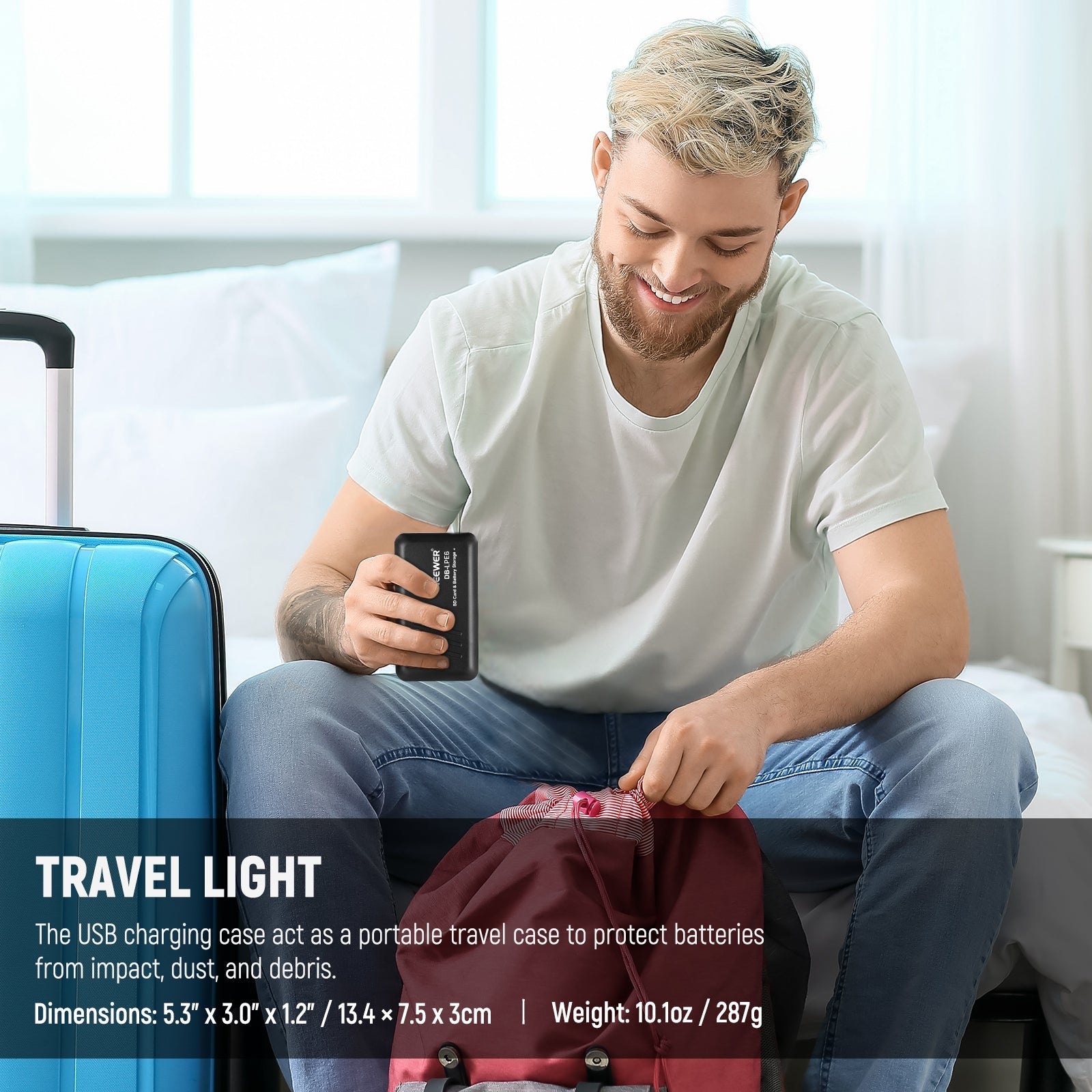 - Versatile Charging Case- Not just a charger. The USB charging case can simultaneously charge two batteries and act as a portable travel case to protect batteries from impact, dust, and debris. It also features two SD card holders and works as a portable charger for smartphones when batteries are installed inside