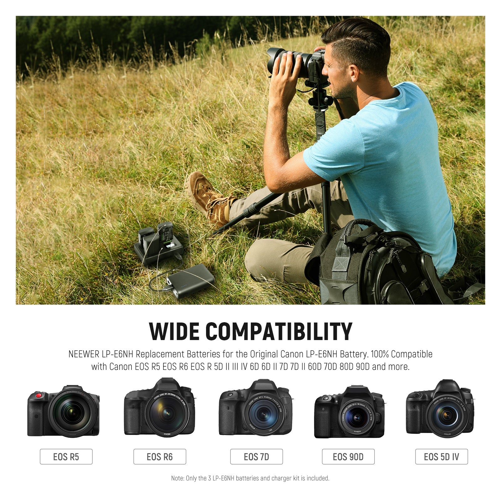 - Fully Compatible With Canon Cameras Powered by LP-E6NH Battery- NEEWER LP-E6NH replacement batteries are compatible with Canon EOS R7 R5 EOS R6 EOS R 5D II III IV 6D 6D II 7D 7D II 60D 70D 80D 90D cameras and other devices powered by LP-E6NH battery. The charger is compatible with LP-E6NH and LP-E6 Li-ion battery packs