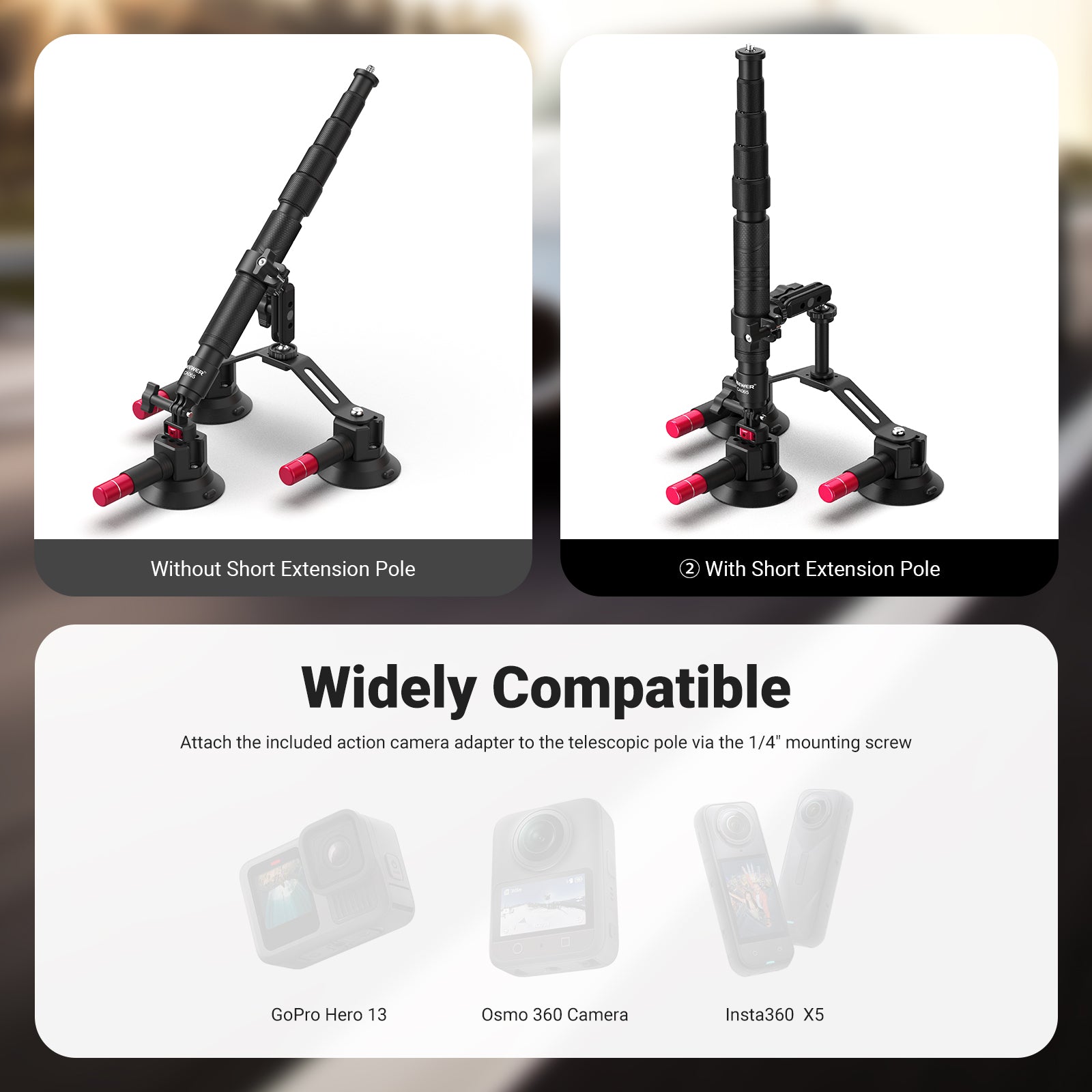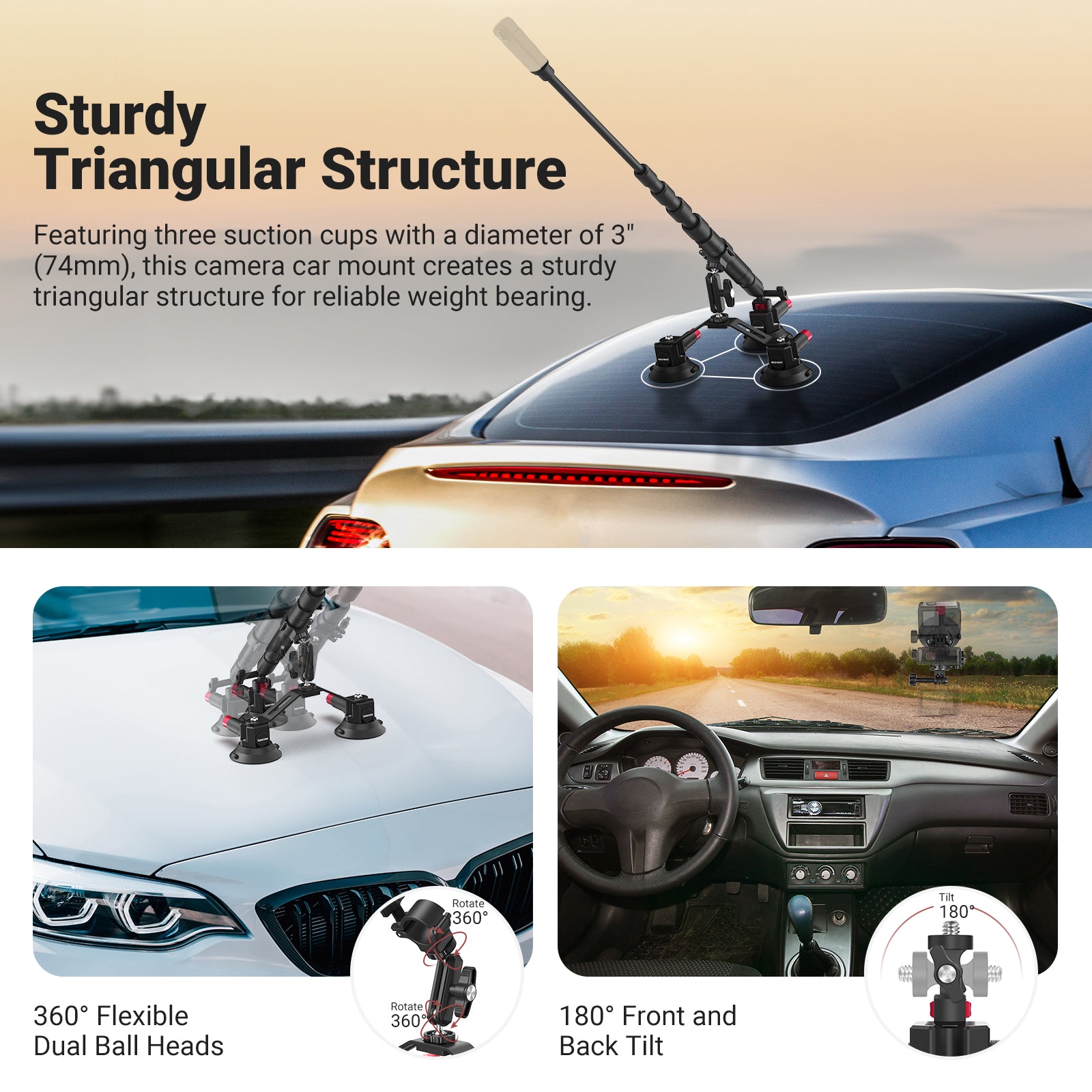 NEEWER CA136 Triple Suction Cup Extension Pole Car Mount Kit