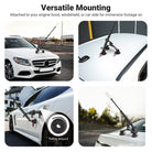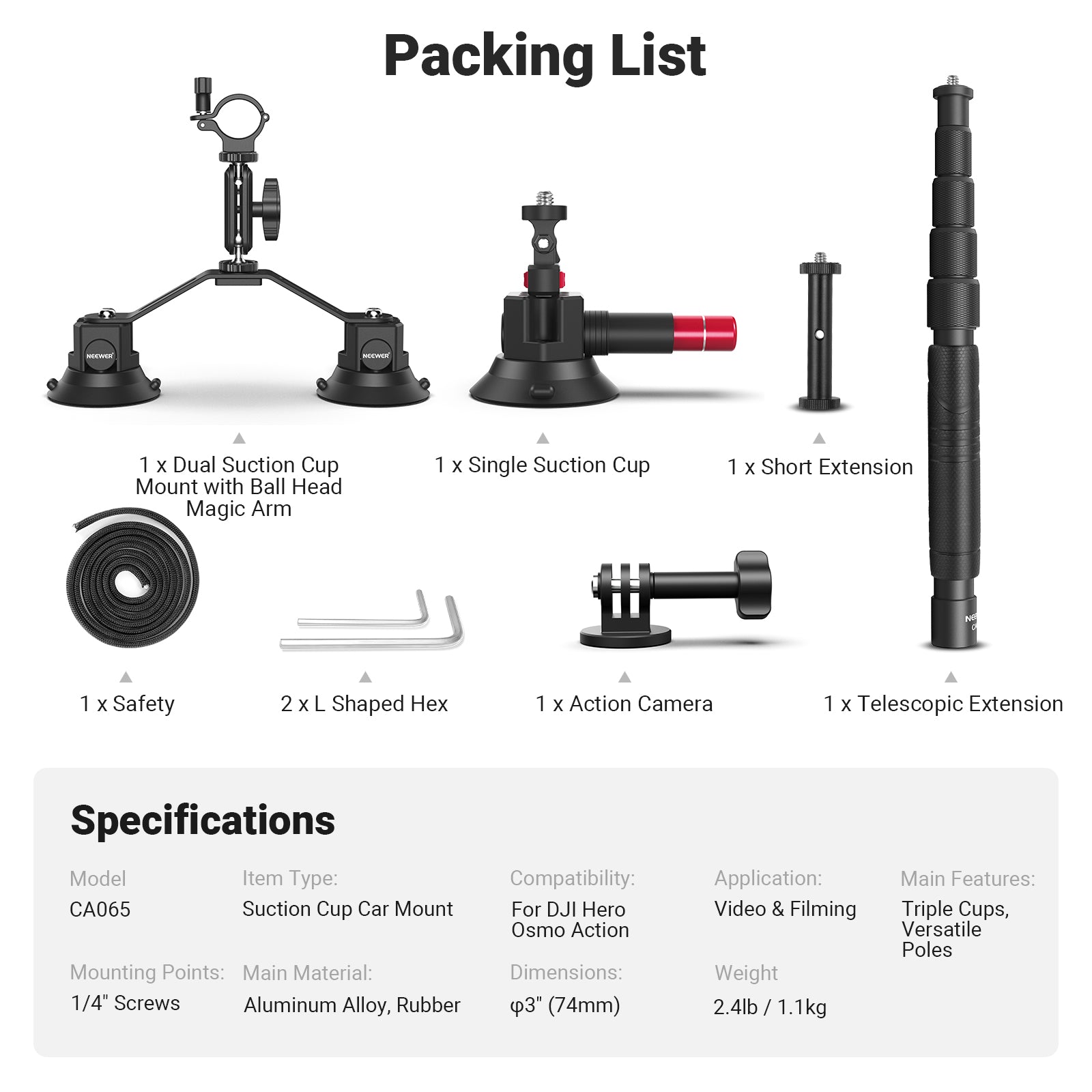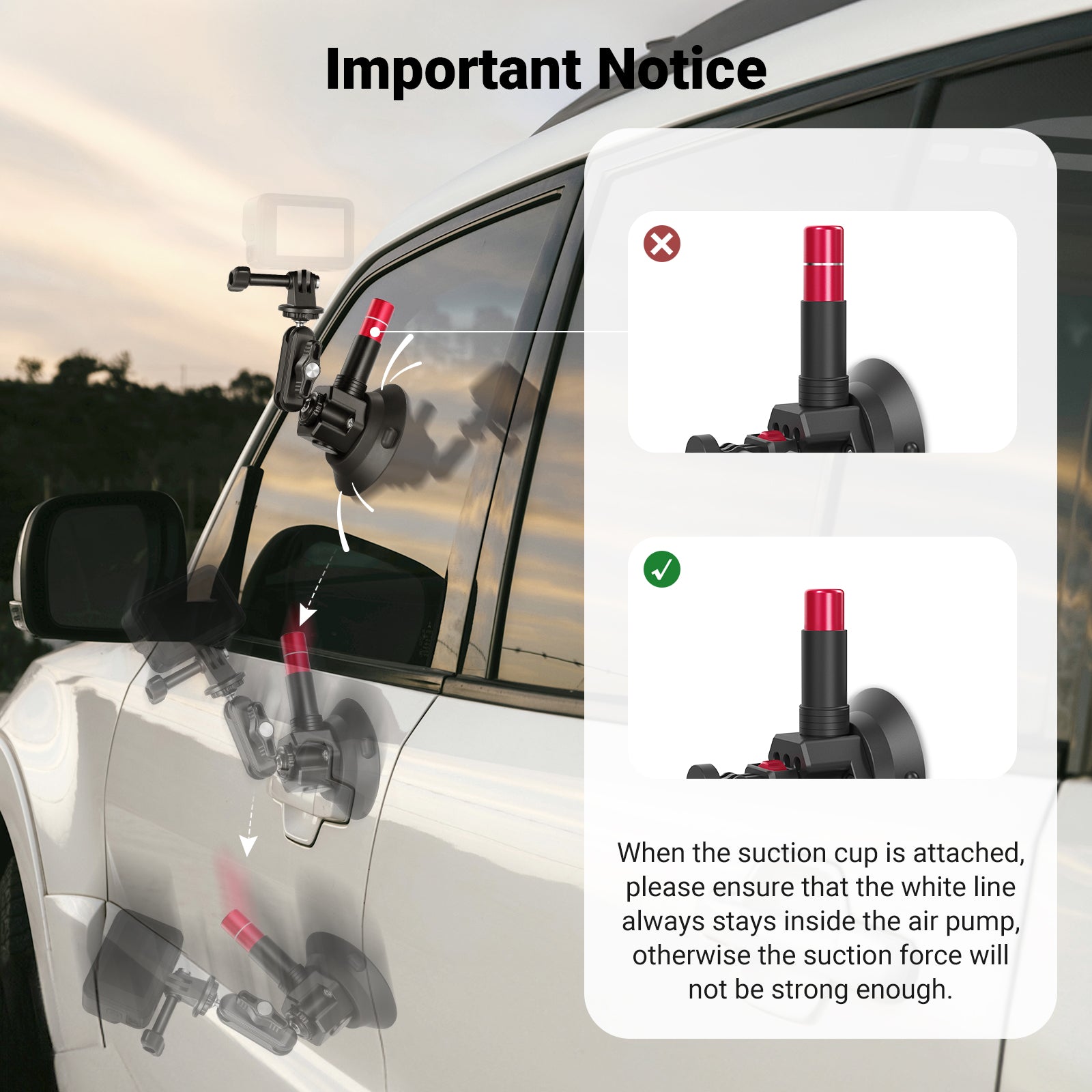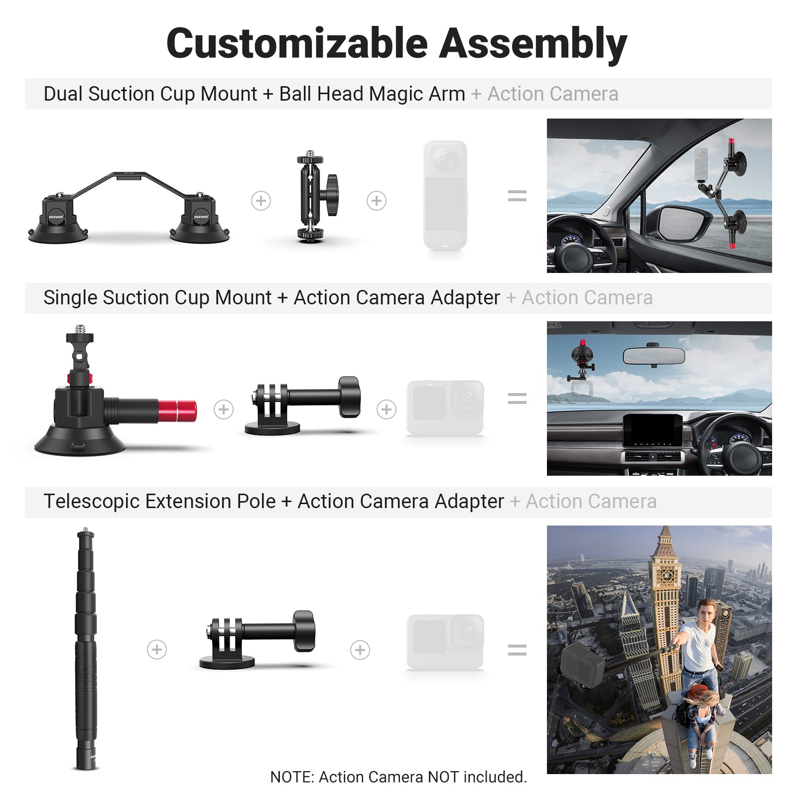 - Triple Suction Cup Car Mount Kit- Capture immersive POV (point of view) footage from unique driving angles like your engine hood, windshield inside/outside, car dash, or car side. The suction cup camera mount stand holder securely attaches your action camera with three powerful suction cups, and enables flexible positioning with extension poles and a ball head magic arm for video recording, with a safety lanyard for added safety. Note to use at speeds below 80 km/h to prevent accidental drops
