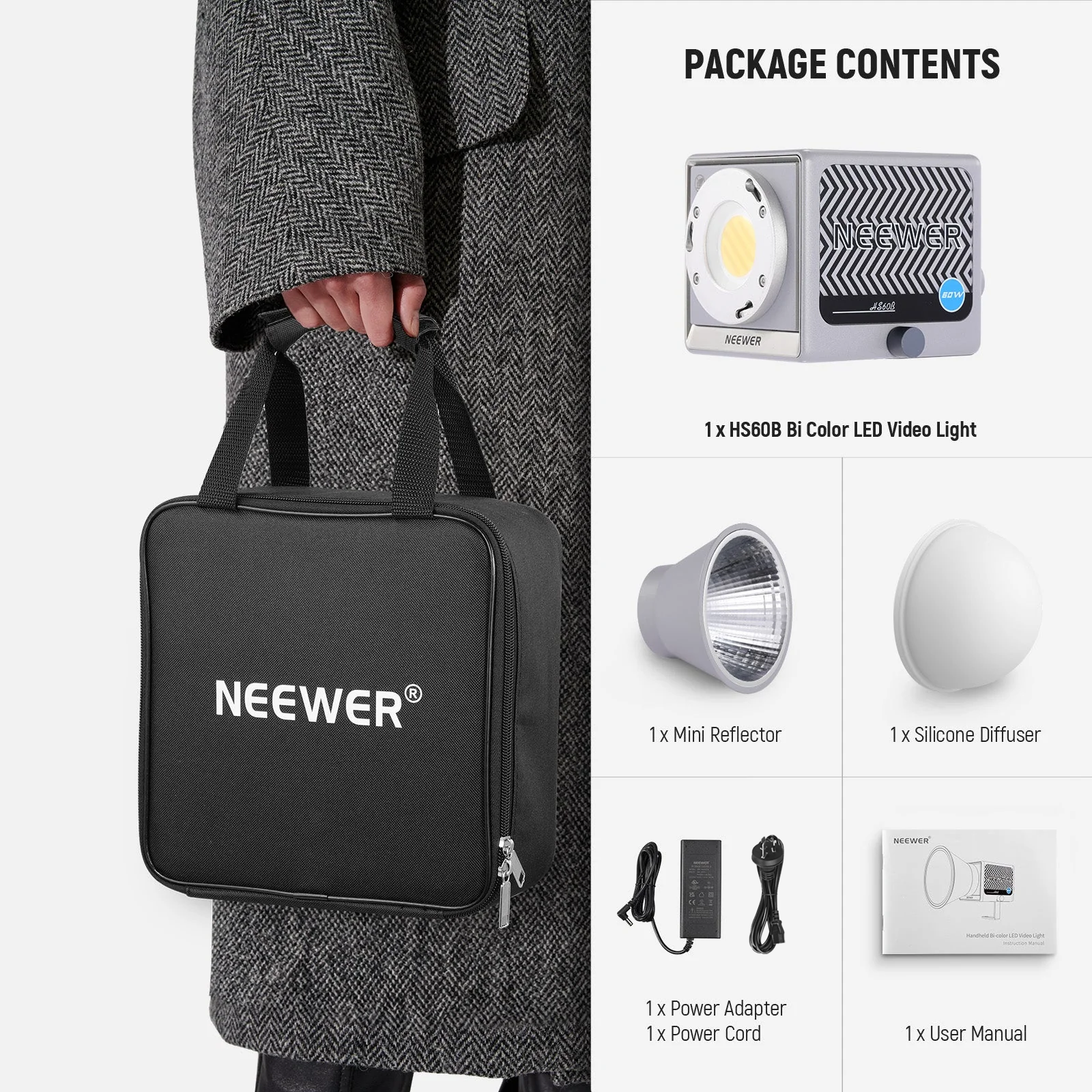 Handheld Mini LED Video Light- At 3.8" x 3.8" x 5.7"/96 x 96 x 145mm and 11.3oz/320g (with reflector), this mini portable LED video light for photography lighting can fit inside your palm and easily transfer from one place to another. NEEWER HS60B lighting kit can be used as the key light or fill light for camera photo shooting, studio portraits, photoshoots, podcast videography, filming, outdoor interviews, live streaming, wedding photography, vlogging, and more - Premium Bi-Color Illumination- COB LEDs are bright, energy efficient, and flicker free―offering high 60W output and 35000lux/1m illuminance with the standard reflector. The 2700K-6500K color temperature range gives you cool and warm tones. PWM technologies allow smooth and precise dimming from 0 to 100%. 12 scene effects make your videos creative. CRI/TLCI97+ ensures impeccable color reproduction