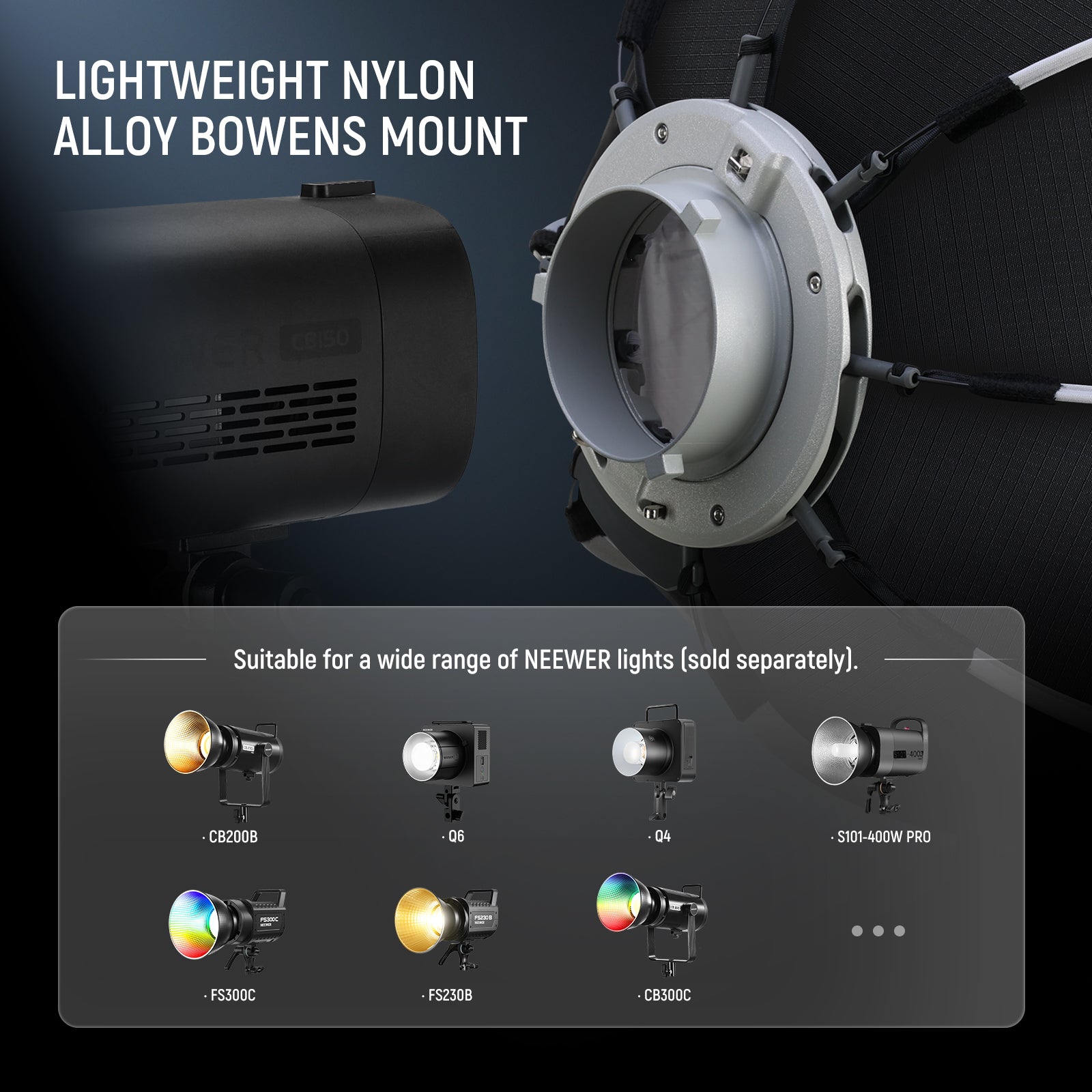 - Universal Bowens Mount- With standard Bowens mount and built in umbrella hole. Compatible with a great variety of light modifiers, including softboxes, reflectors, beauty dishes, snoots, and more. The stand mount can be 180° smooth tilting and lets you easily adjust the light angles with a locking knob to secure the light firmly on a light stand. Built with robust aluminum alloy shell and also small enough to carry around for quick lighting