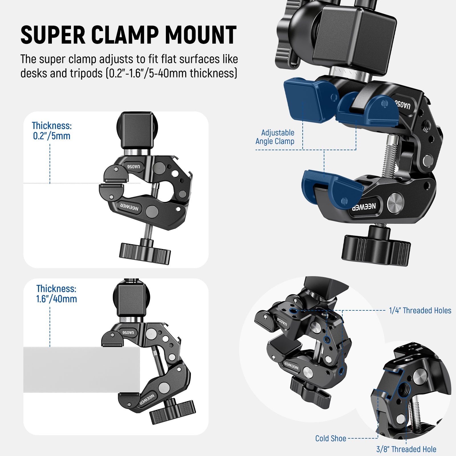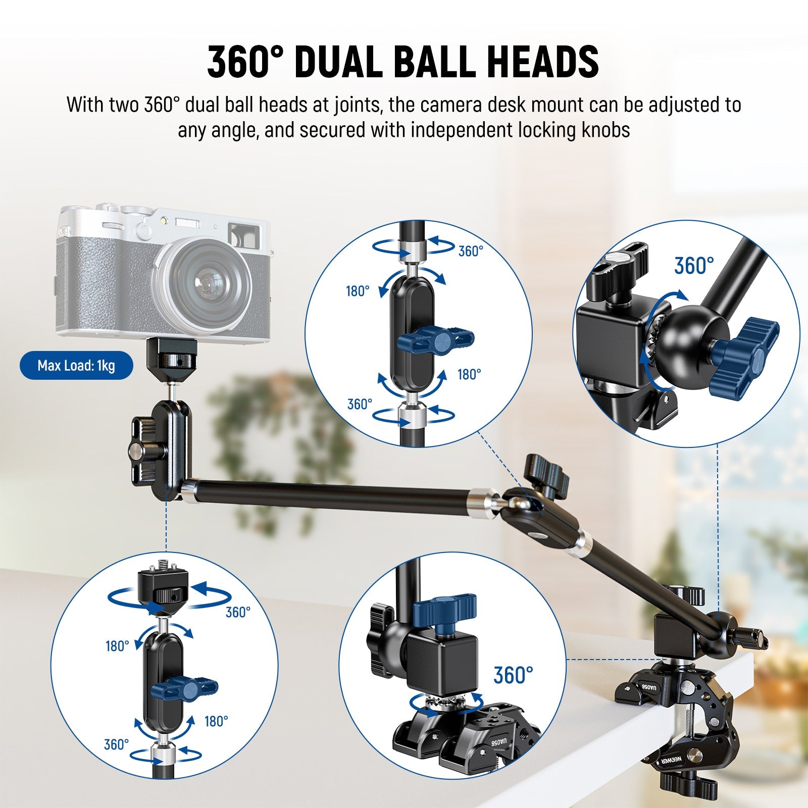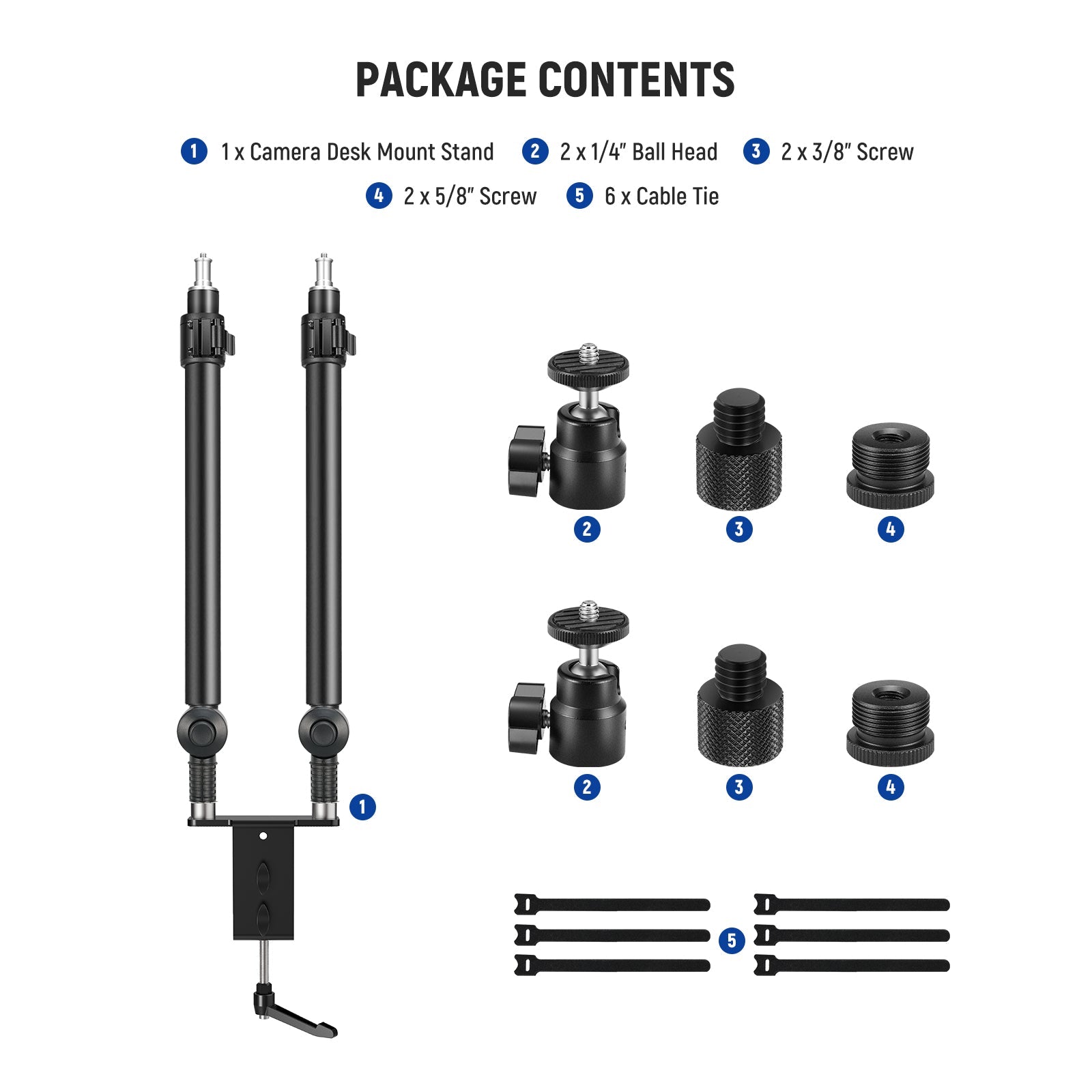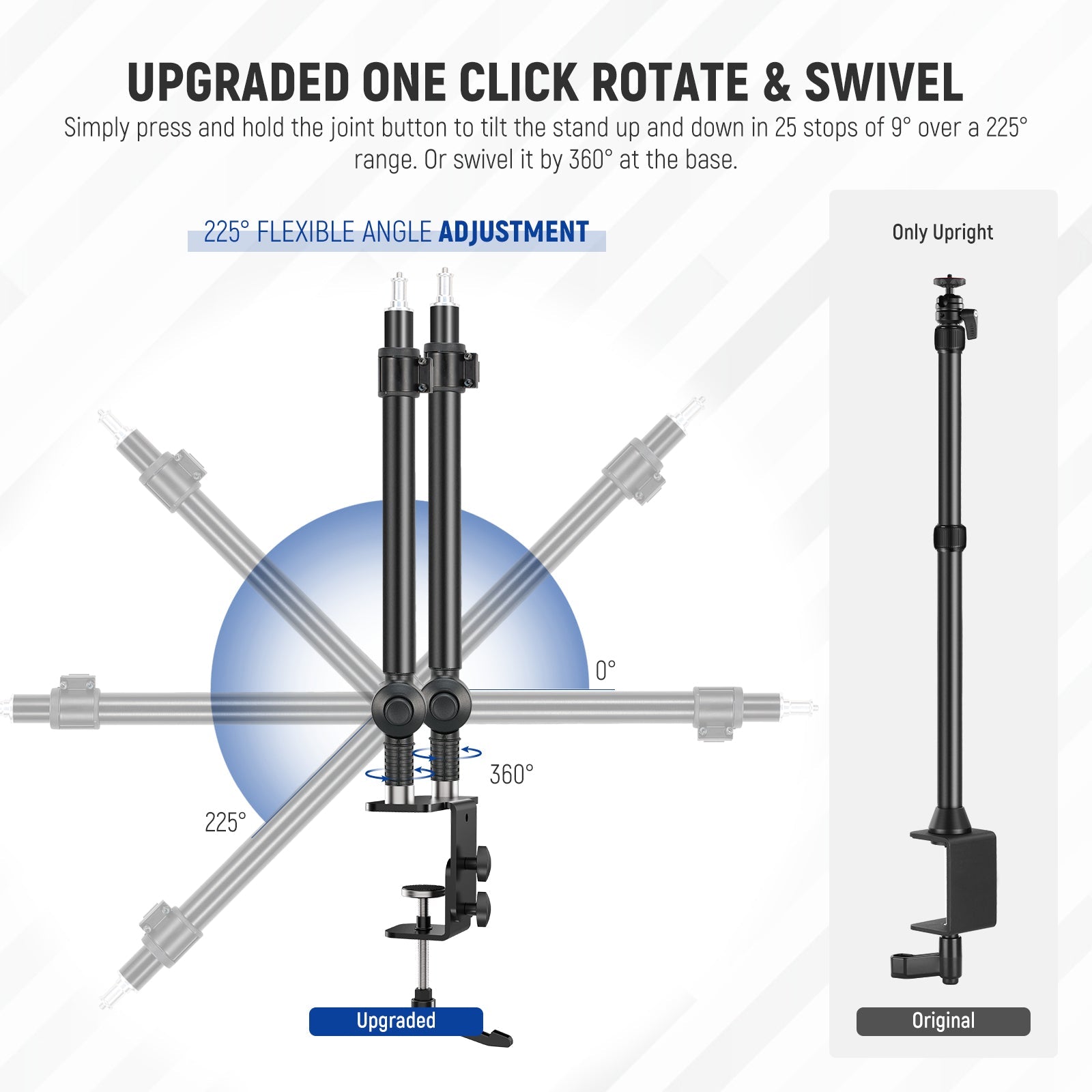 The NEEWER Camera Desk Mount Rig transforms your desk or table into a versatile photography workstation with optimized space usage. These desk mount stands can securely attach various photography accessories and equipment, making them perfect for live streaming, still-life photography, unboxing reviews, remote work setups, and photography lighting. Choose a reliable camera desk mount to support DSLR cameras, phone holders, ring lights, key lights, and more.