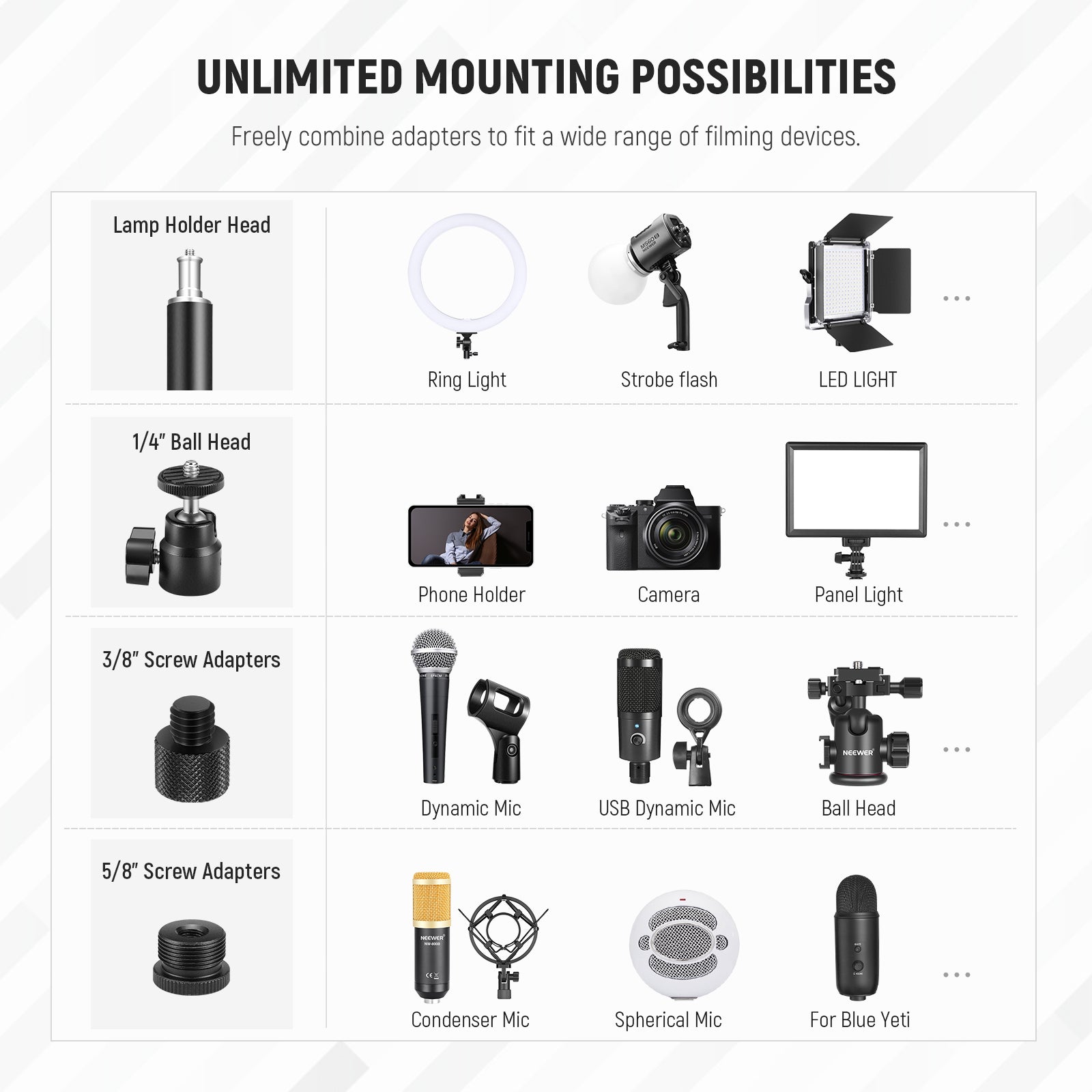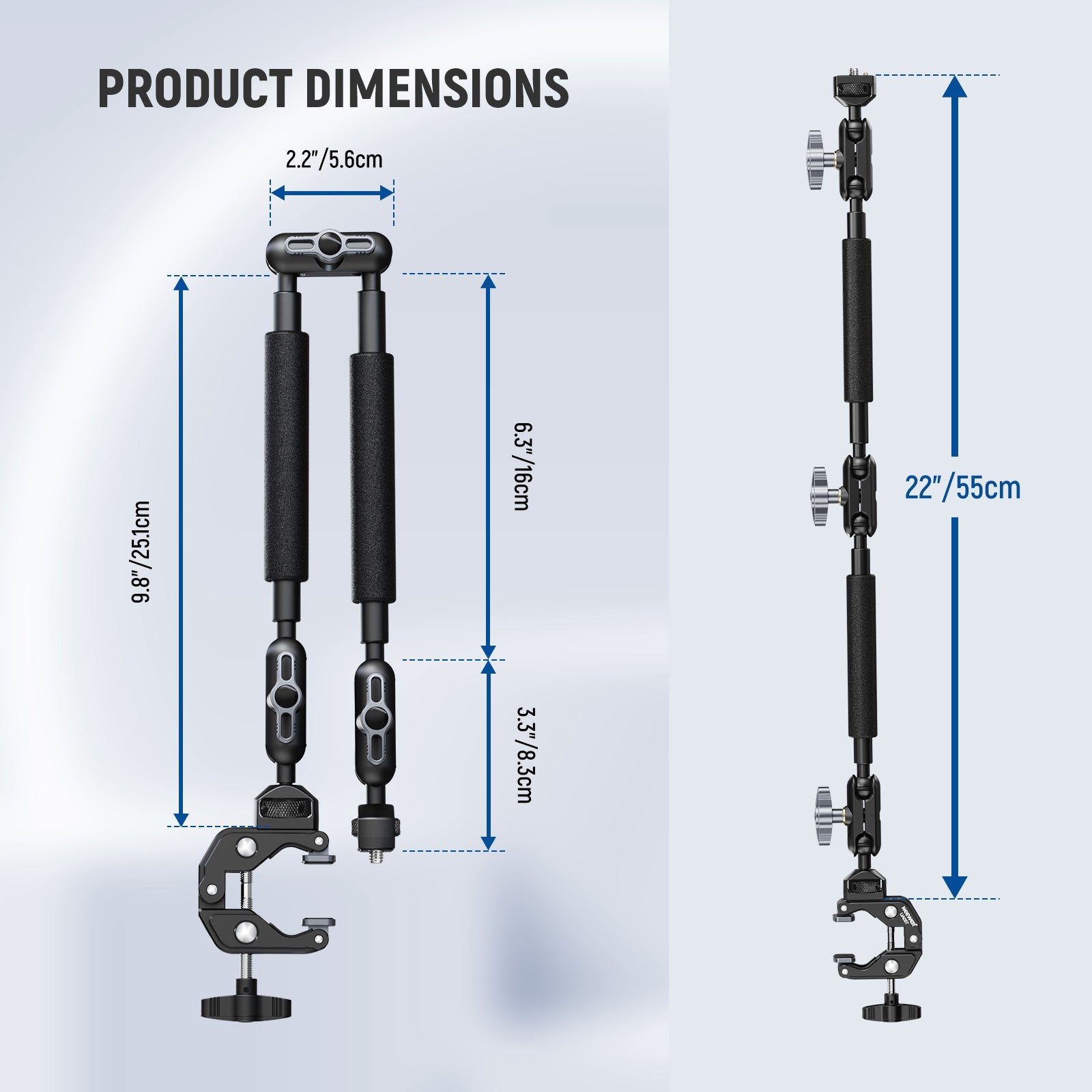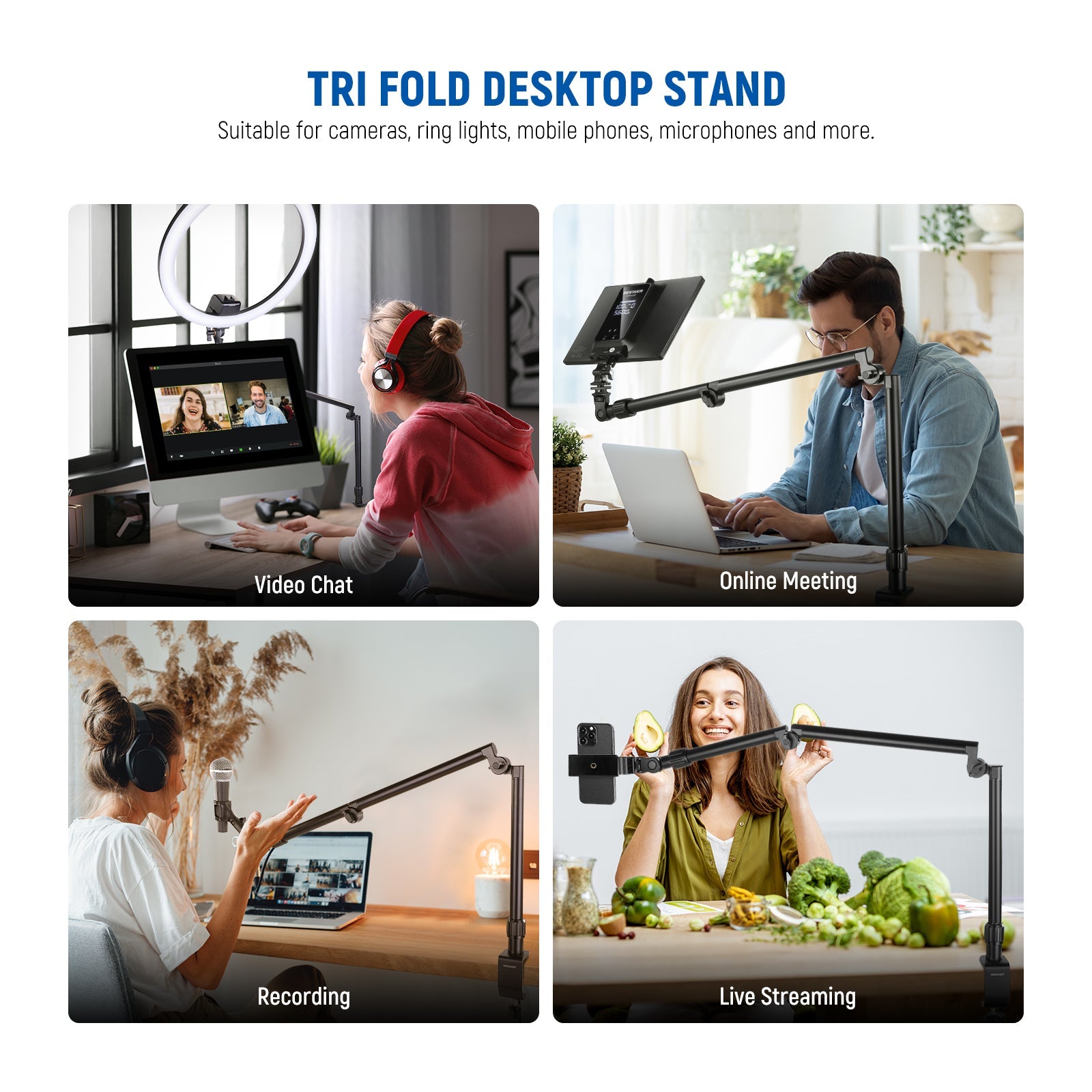 The NEEWER Camera Desk Mount Rig transforms your desk or table into a versatile photography workstation with optimized space usage. These desk mount stands can securely attach various photography accessories and equipment, making them perfect for live streaming, still-life photography, unboxing reviews, remote work setups, and photography lighting. Choose a reliable camera desk mount to support DSLR cameras, phone holders, ring lights, key lights, and more.