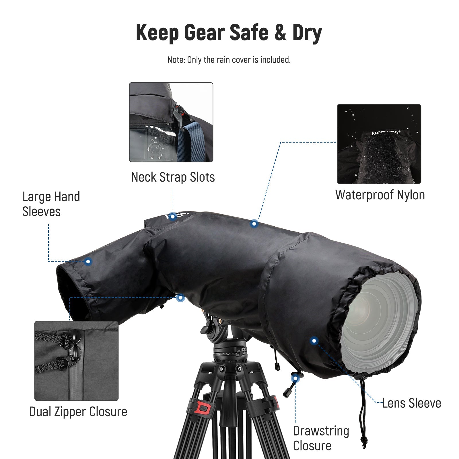 - Easy Access by Hand- Two sleeves for hands to easily get inside the rain cover and operate the camera without any hassle. A camera strap can be connected to the rain cover through the strap holes to facilitate handheld camera shooting