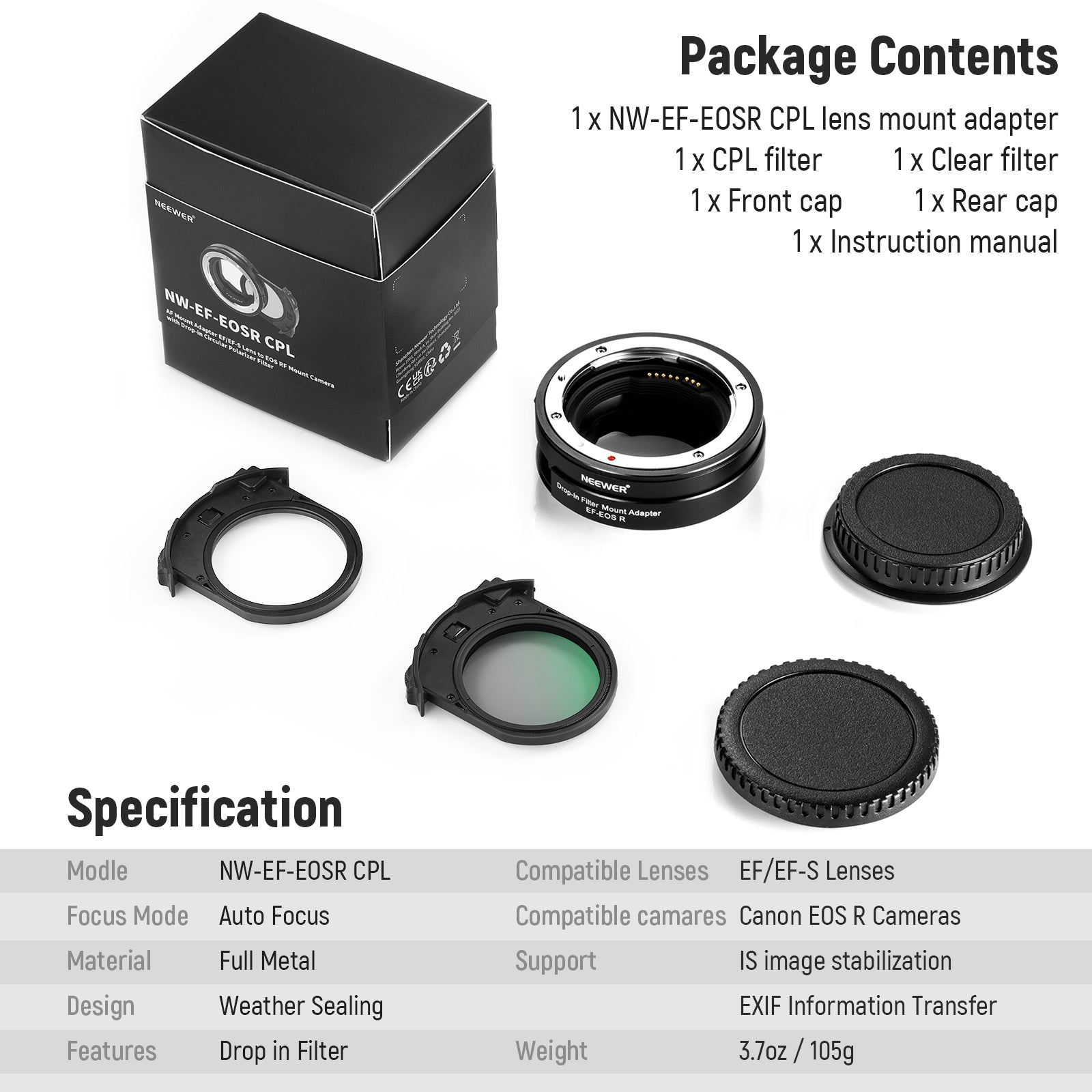 - Sturdy All Metal Build- The full metal body of the NW-EF-EOSR CPL lens adapter makes it robust and durable. The CPL filter is water repellent, dust & oil proof, and scratch resistant with multi layer coatings