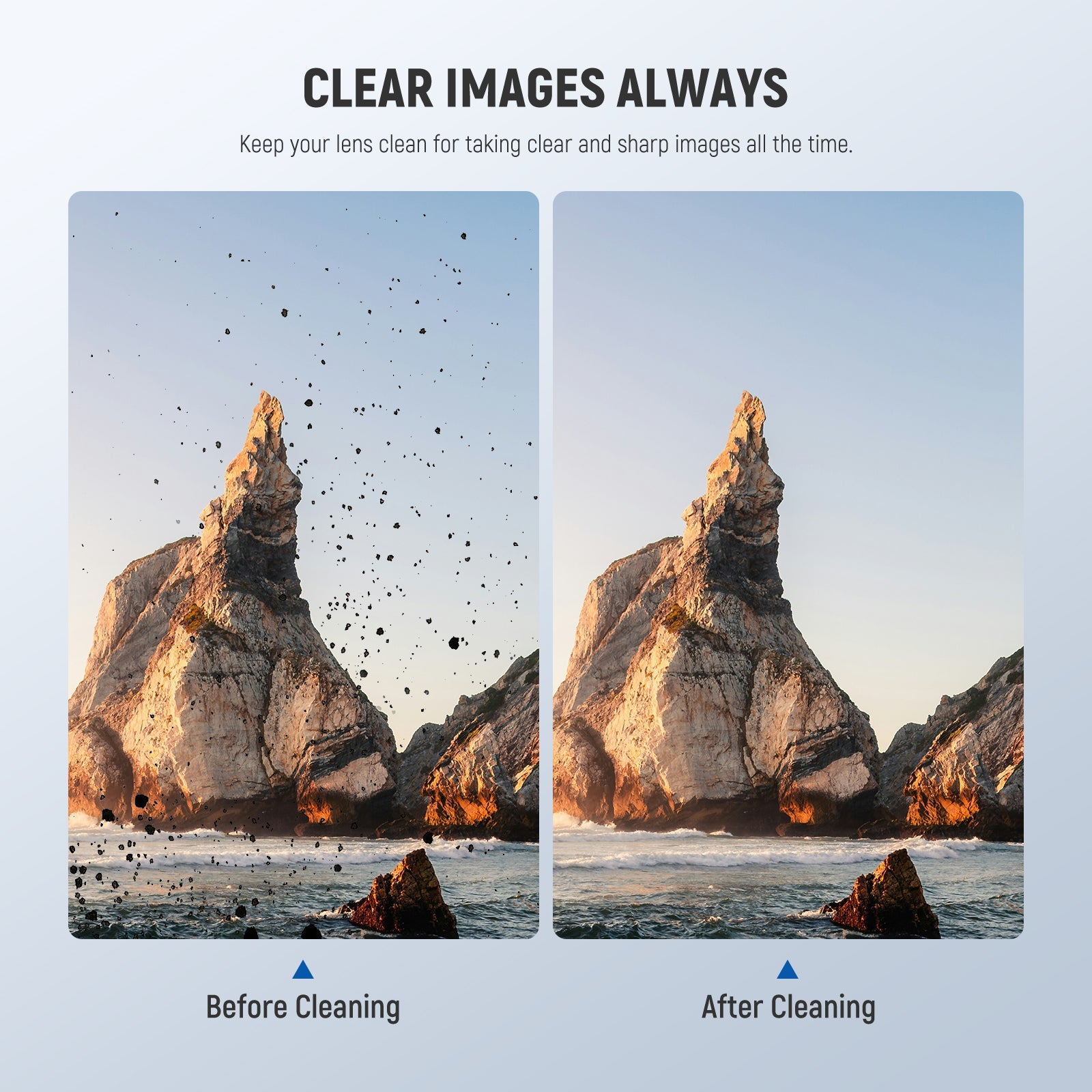 - Cleaner Spray & Cleaning Clothes- The 20ml cleaner spray adopts a non alcohol formula to remove smudges from all lens types without leaving streaks. Spray directly onto the lens and wipe clean with the included cloths. Thees reusable cloths are also ideal for cleaning delicate surfaces of electronics, monitors, lenses, glasses, watches, and jewelry