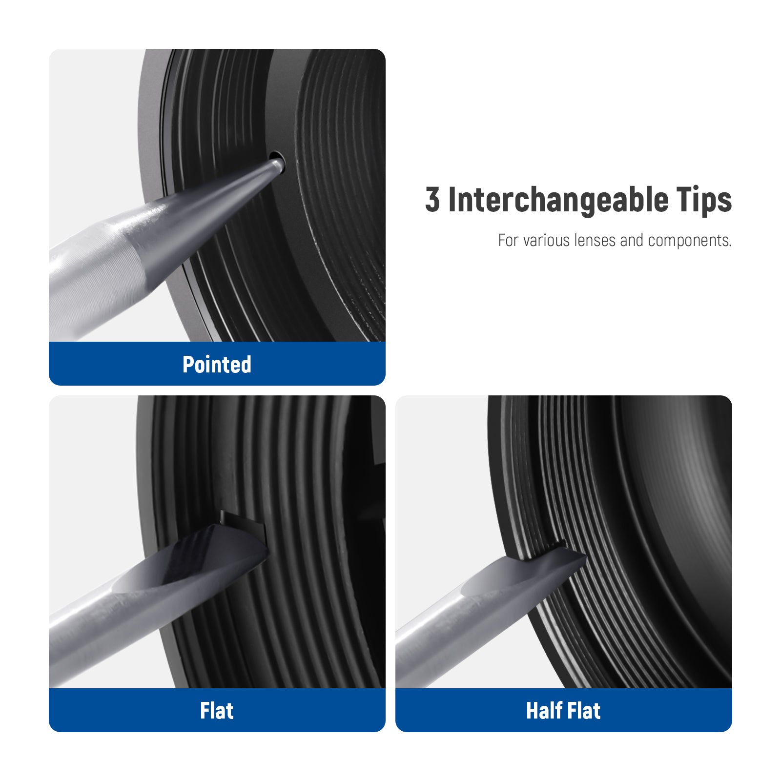 • 3 Replaceable Tips- 3 types of interchangeable tips (pointed, flat, half flat) are suitable for different lenses and components