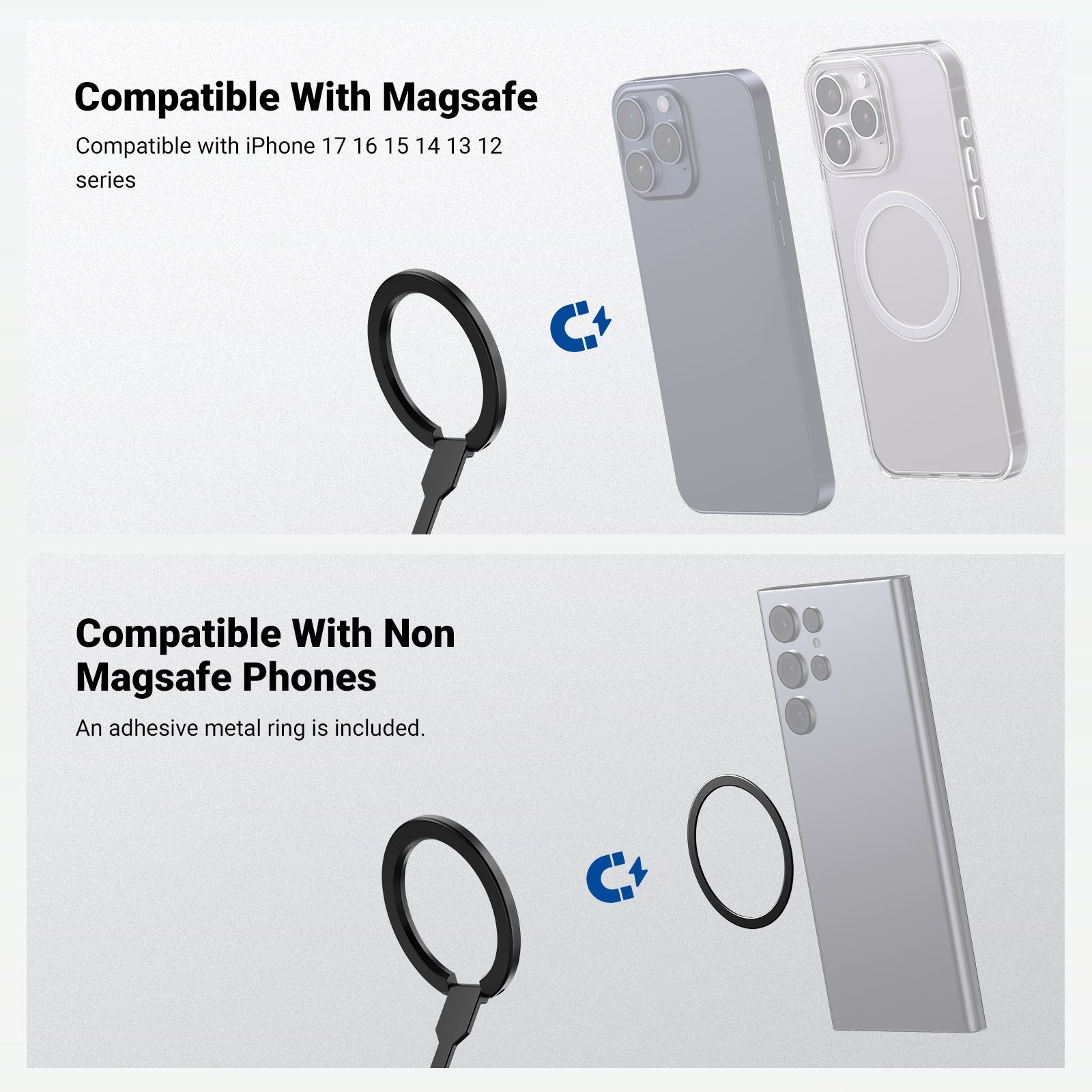 - Magnetic Phone Mount- The phone holder stand for desk or smooth car dash is compatible with iPhone 17 16 e 15 Pro Max Plus 14 13 i Phone 12 Mag Safe case/cover photography accessories for pov filming or phone camera video recording; as finger ring snap grip kickstand attachment compatible with Samsung Galaxy S25 S24 Ultra Google Pixel 10 9 Pro Huawei with the magnet ring