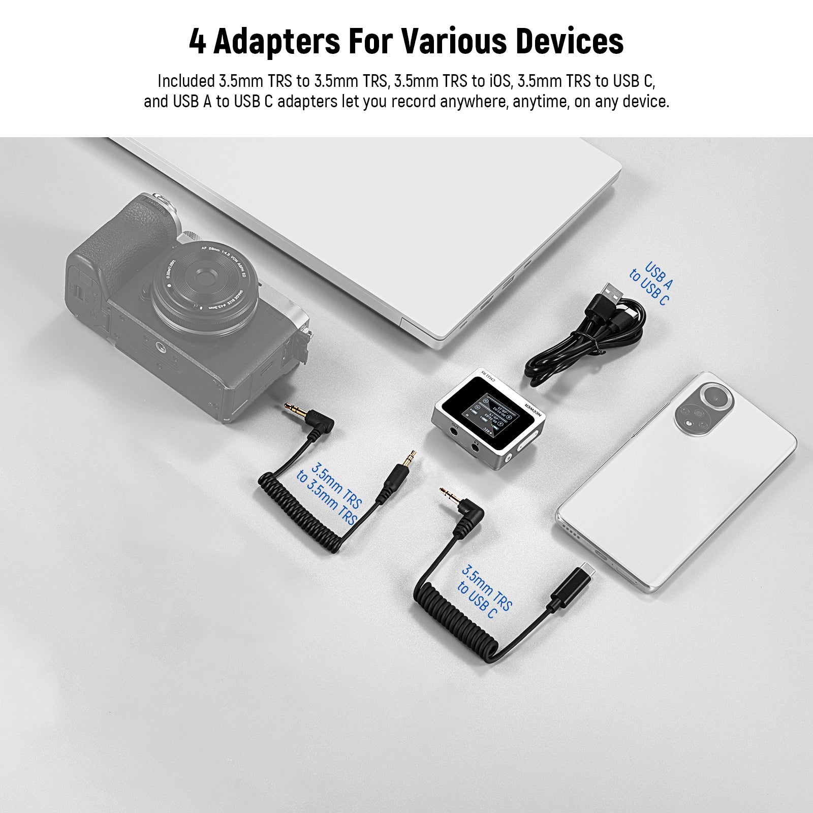 - Plug & Play RX for Three Devices- This plug and play lapel microphone requires no app. With two OTG adapters and a 3.5mm TRS audio cable, the RX (receiver) connects up to three devices at the same time, compatible with iPhone, iPad, Android smartphones & tablets, laptops, computers, DSLR cameras, and camcorders. When working with two devices, it supports simultaneous audio monitoring, noise reduction, and mute