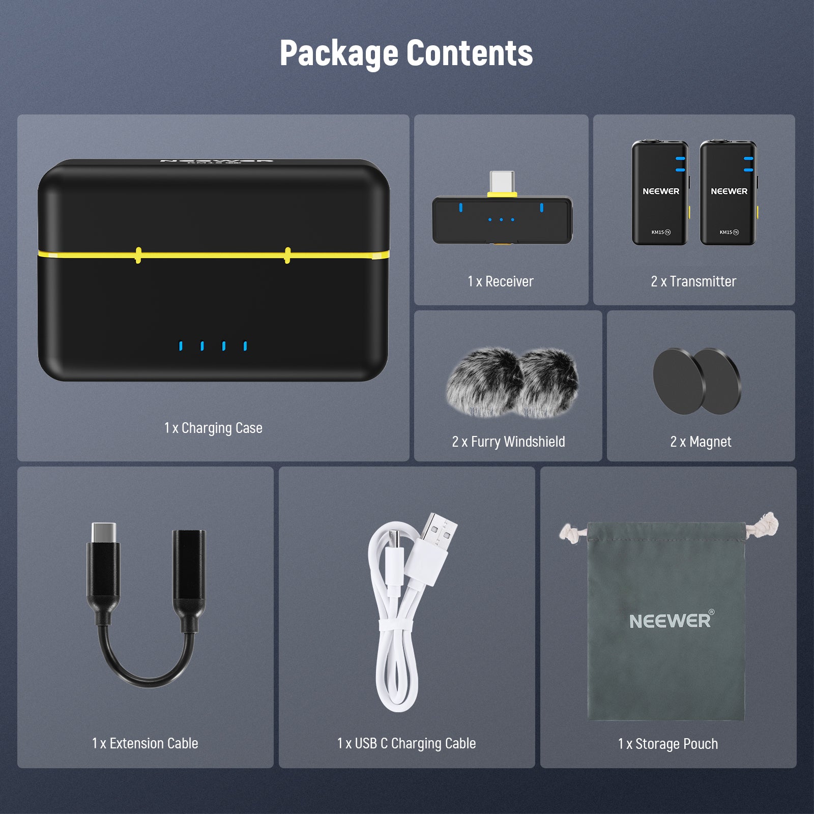 - Mini Wireless Lavalier Lapel Mic- This wireless microphone system features two transmitters (TX) with a MUTE button and SET button for photo capture (double press), a USB C receiver (RX) that offers 3 volume levels, and a portable charging case. Upgraded with a 48kHz/24bit sampling rate and 76dB signal to noise ratio, also compatible with NEEWER CM28 Max