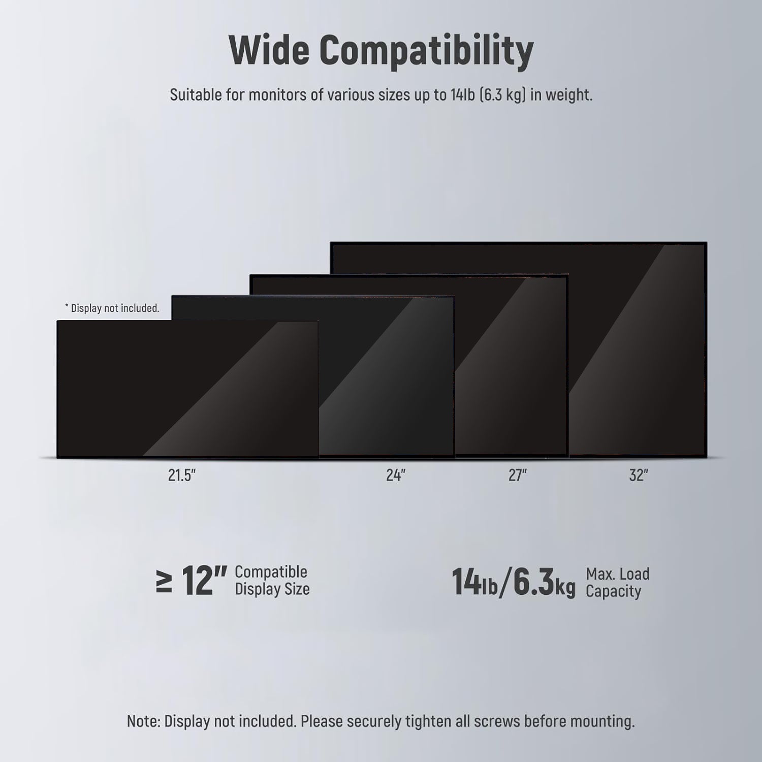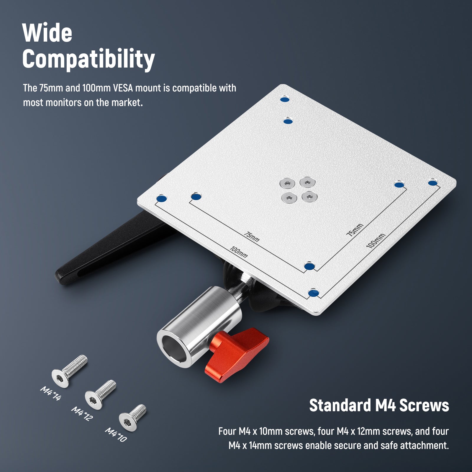 • Standard M4 Screws & VESA Plate Compatibility- Four M4 x 10mm screws, four M4 x 12mm screws, and four M4 x 14mm screws enable secure and reassuring attachment to a monitor with different thread depths. The 75mm and 100mm VESA mount is compatible with most monitors on the market