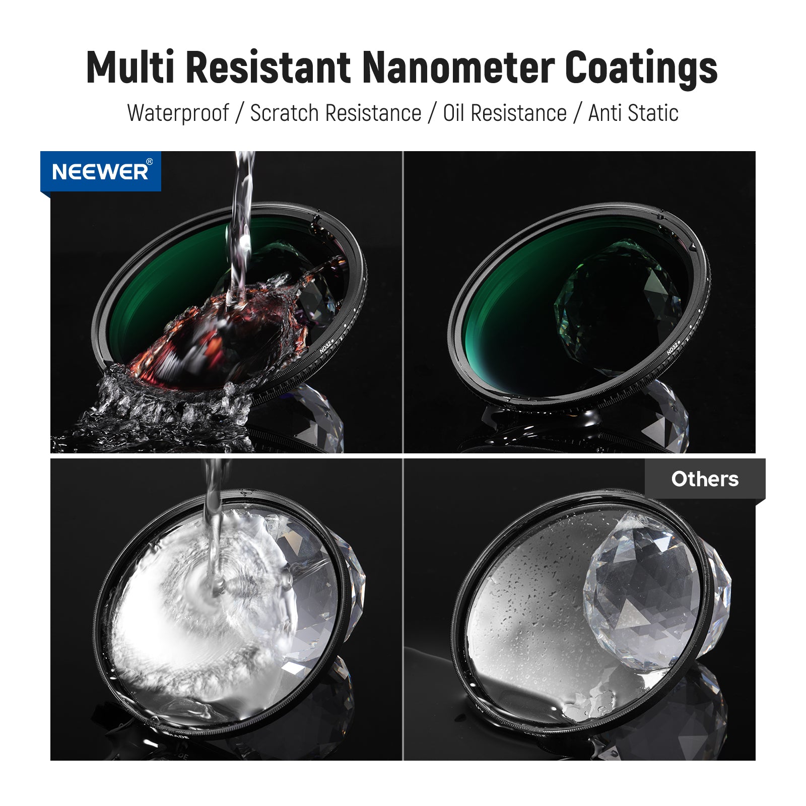 - Multi-Layer Nano Coatings- The dual-sided 30 layers of Nanocoatings make the filter water-repellent, oil-proof, and scratch resistant. The multi-coated filter also effectively reduces glare and reflections and delivers a natural photo look