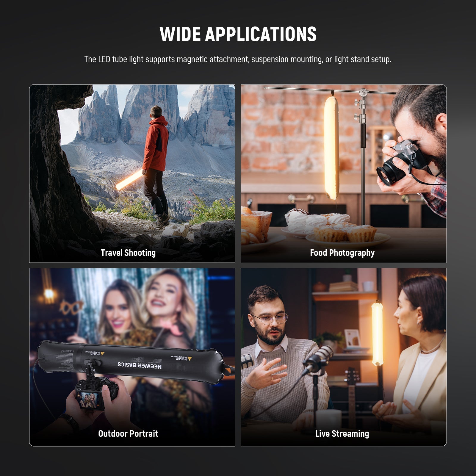 - Introducing NEEWER BASICS- Simple and practical, NEEWER BASICS is an economical product line that focuses on essential functions and designs, without unnecessary extras and materials. The GC10B is a lightweight & portable tube light, featuring a reliable exterior made of soft and wear resistant TPU and silicone to protect the internal LEDs and electronics from scratches and damage. The handheld LED light is quick to set up and break down, simply blown up using the inflator