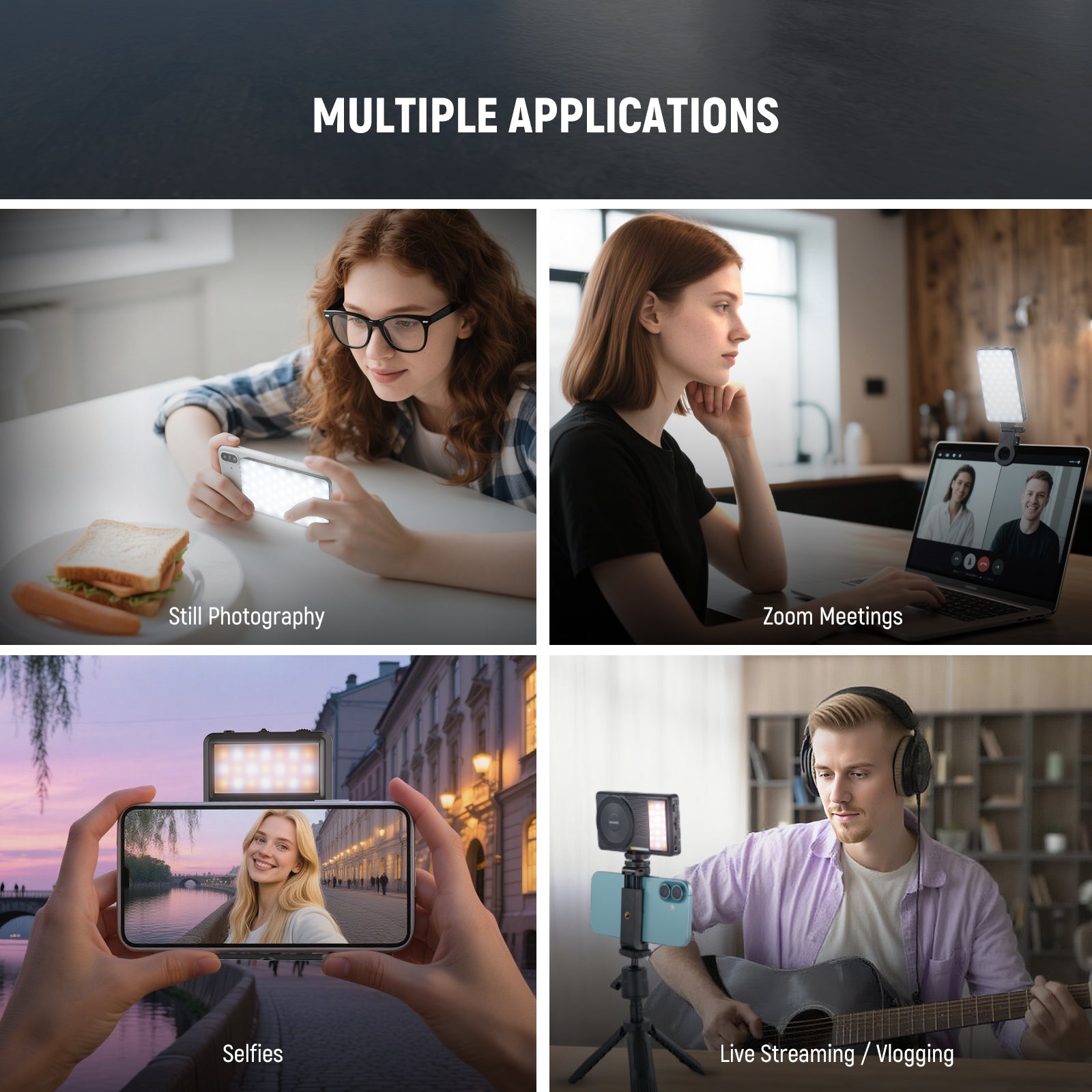- 2700K-8300K & Stepless Dimming- The panel fill light offer stepless color temperature adjustment from 2700K-8300K, with 3 fixed settings (2700K/4200K/8300K) and 1%-100% dimming range on both sides, allowing precise lighting control for overhead mount phone selfie pictures, live streams, desk video calls, computer Zoom lighting, travel creation films, etc. Ideal as essential and must have photography lighting gear for social media content creators, makeup artists, streamers, and influencers