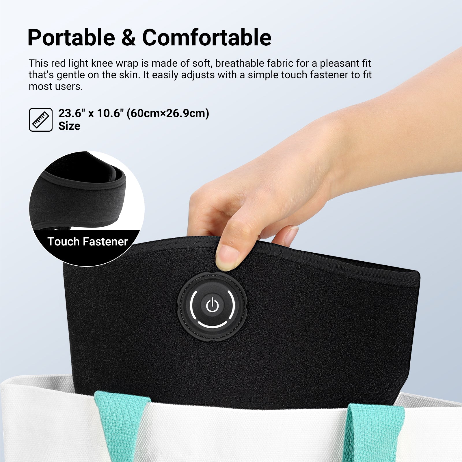 - Comfortable to Wear- This red light knee wrap is made of soft, breathable fabric for a pleasant fit that’s gentle on the skin. Measuring 23.6" x 10.6", it easily adjusts with a simple touch fastener to fit most users.
