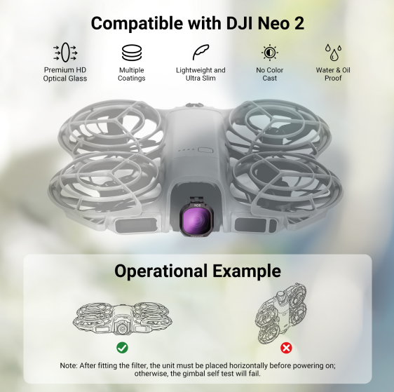- Compatible with DJI NEO 2- Only compatible with DJI NEO 2 Drone. This filter accessories kit includes 1x UV, 1x CPL (circular polarizing), and 4x ND filter. Lightweight and slim, they preserve the precise gimbal performance