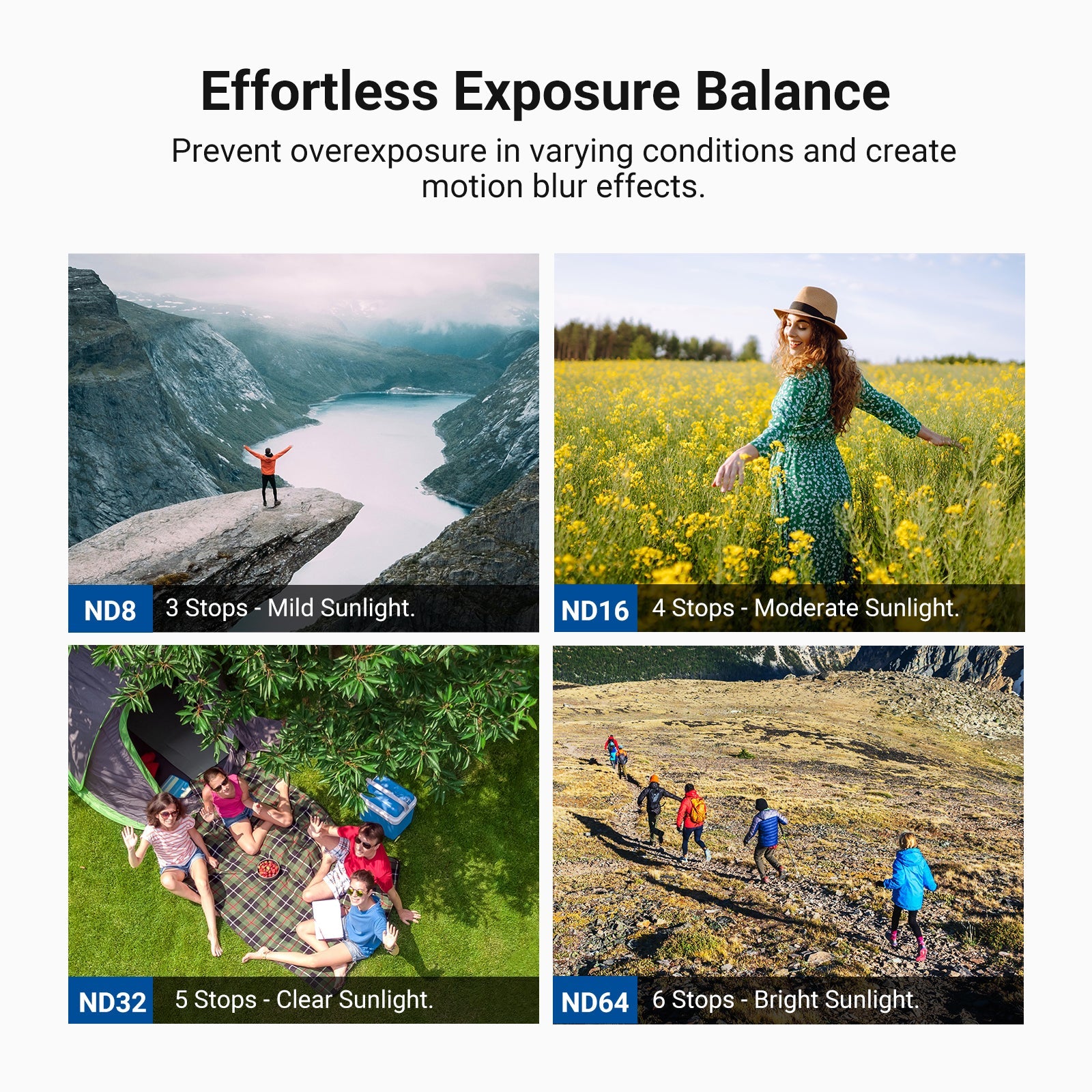 - Effortless Exposure Balance- Four neutral density filters (ND 8/16/32/64) reduce light by 3, 4, 5, and 6 stops for long exposure photography outdoors. They allow you to capture rivers, waterfalls, and other movements with expressive motion blur