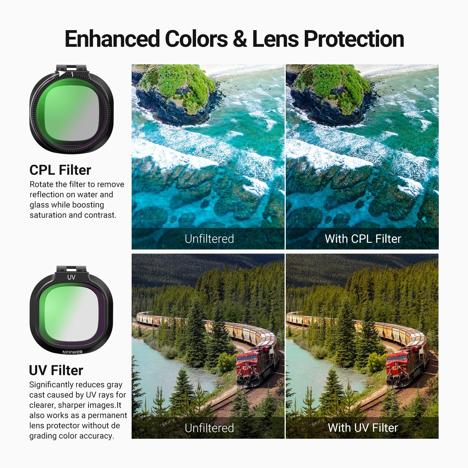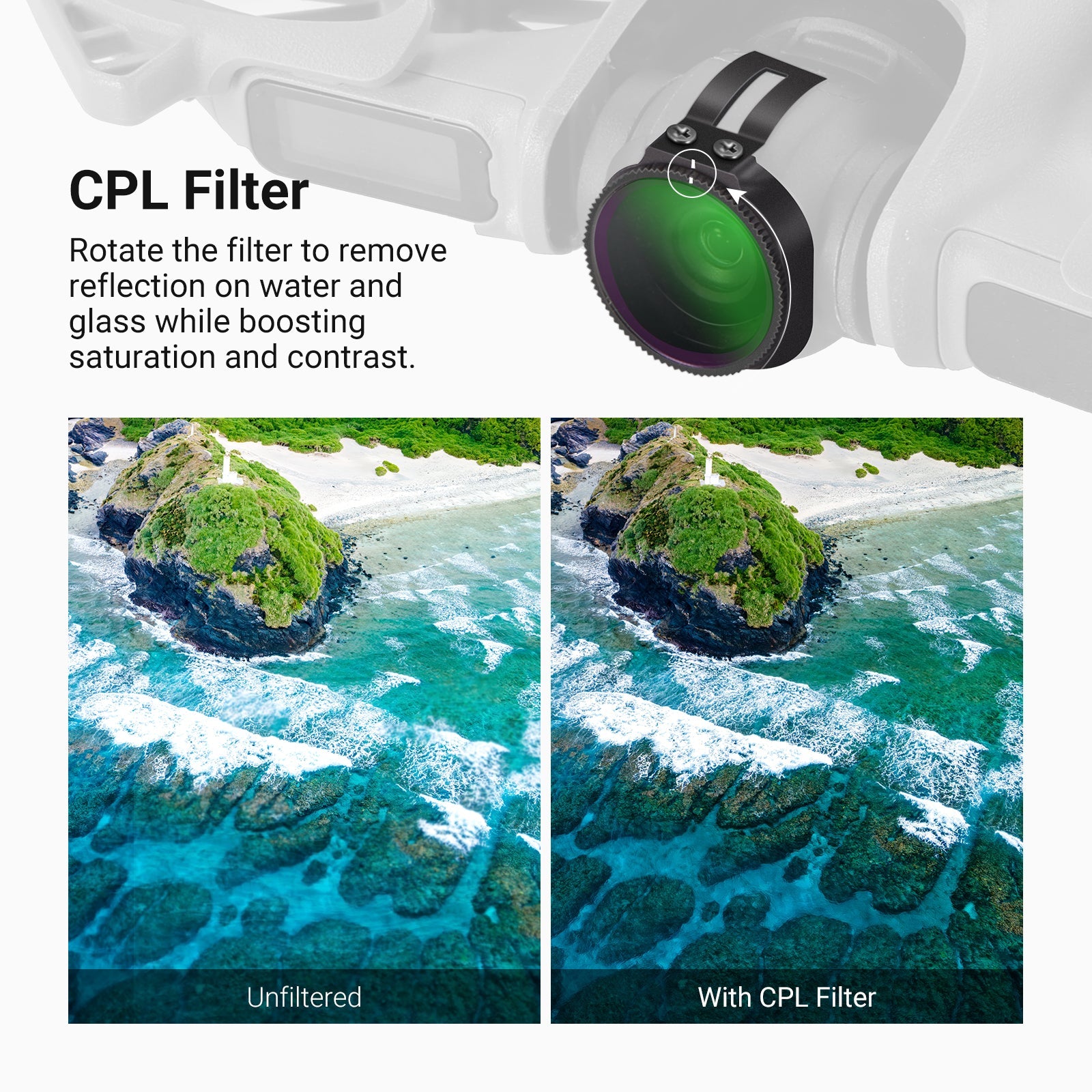 - Minimal Glare, Rich Colors- CPL filter (circular polarizer) minimizes reflection on glass, water, and other nonmetallic surfaces while improving saturation and contrast