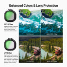 - Protective & Clear UV Filter- Significantly reduces gray cast caused by UV rays for sharp images or functions as a lens protector— a perfect content creator essential gear and influencer must have equipment for aerial photography and footage