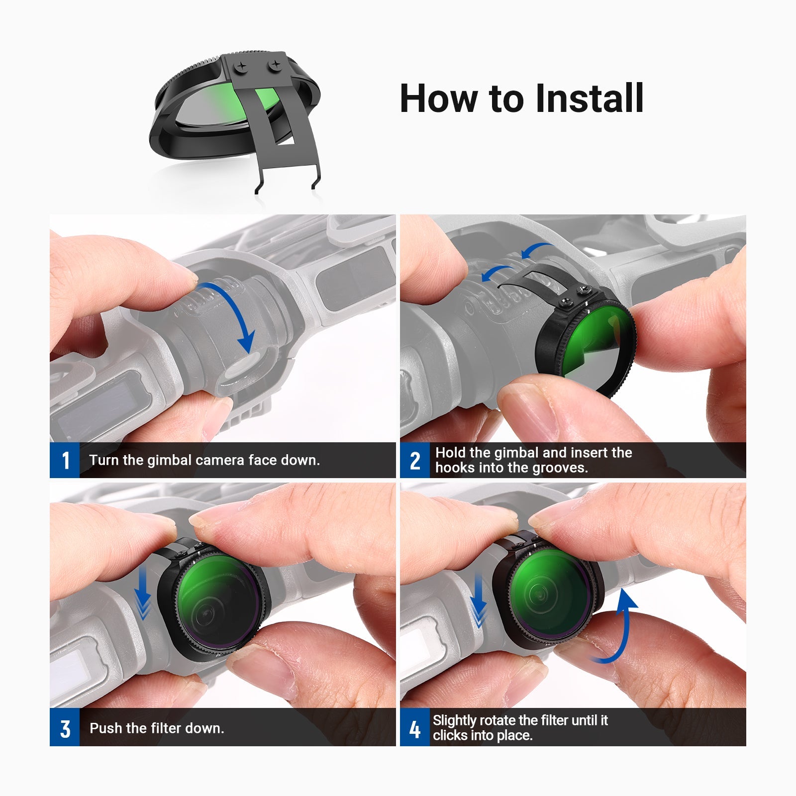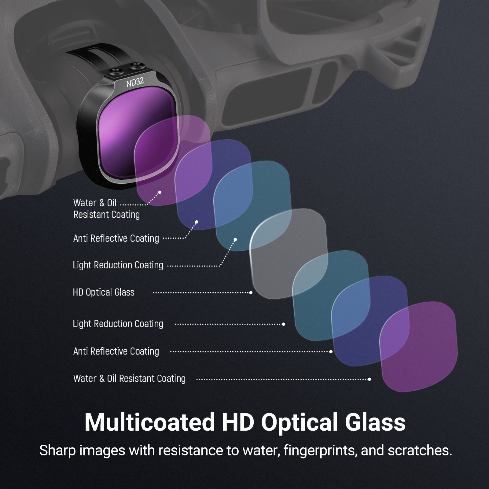 - HD Glass & Snap On Design- Multicoated HD optical glass ensures sharp and natural images while resisting water, fingerprints, and scratches. Simply snap the filter onto the camera with a hook to keep it in place during flight