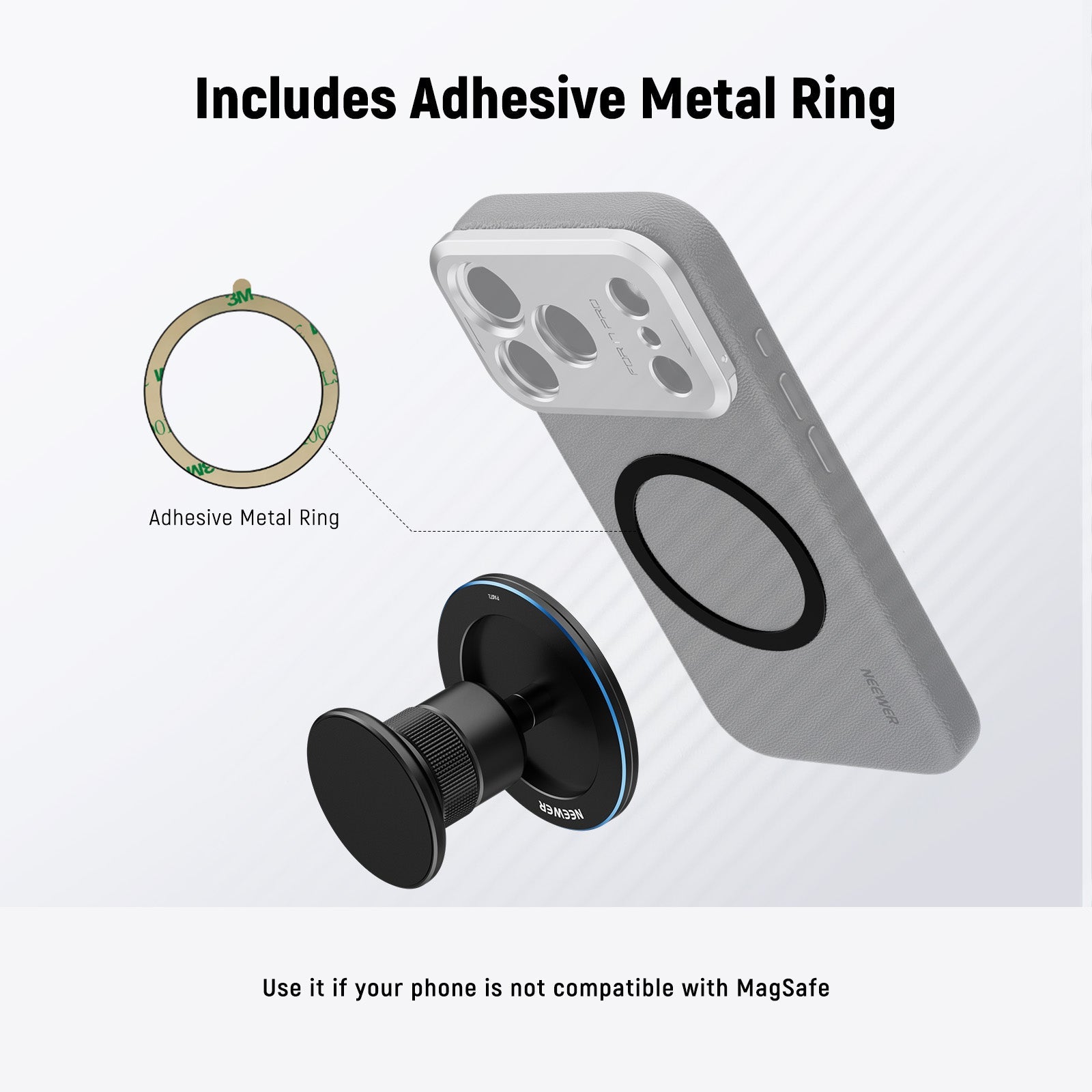 - With Adhesive Metal Ring- If your phone is not compatible with MagSafe (such as Galaxy S25 Ultra, Pixel 9 Pro, or others), stick the adhesive metal ring to the phone / case for secure magnetic attachment