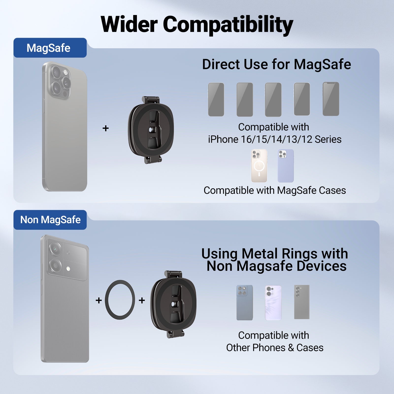 - Magnetic Phone Stand- The tripod phone holder as desk finger grip kickstand attachment or smooth car dash mount is compatible with MagSafe iPhone 17 16 e 15 Pro Max Plus 14 13 i Phone 12 Mag Safe case/cover accessories; compatible with Samsung Galaxy S25 S24 Ultra Google Pixel 10 9 Pro Huawei with the magnet ring for back of phone case