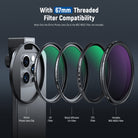 - High Compatibility with 67mm Magnetic Filters- The 67mm phone lens clip fits any filter with 67mm magnetic mount, including CPL polarizing filters, UV filters, as well as effect filters like GND, starburst, black diffusion, blue/gold streak, and more DSLR digital camera lens filters. The included 67mm Variable ND filter can also fit a camera lens (a magnetic adapter ring accessory for the camera lens is required)