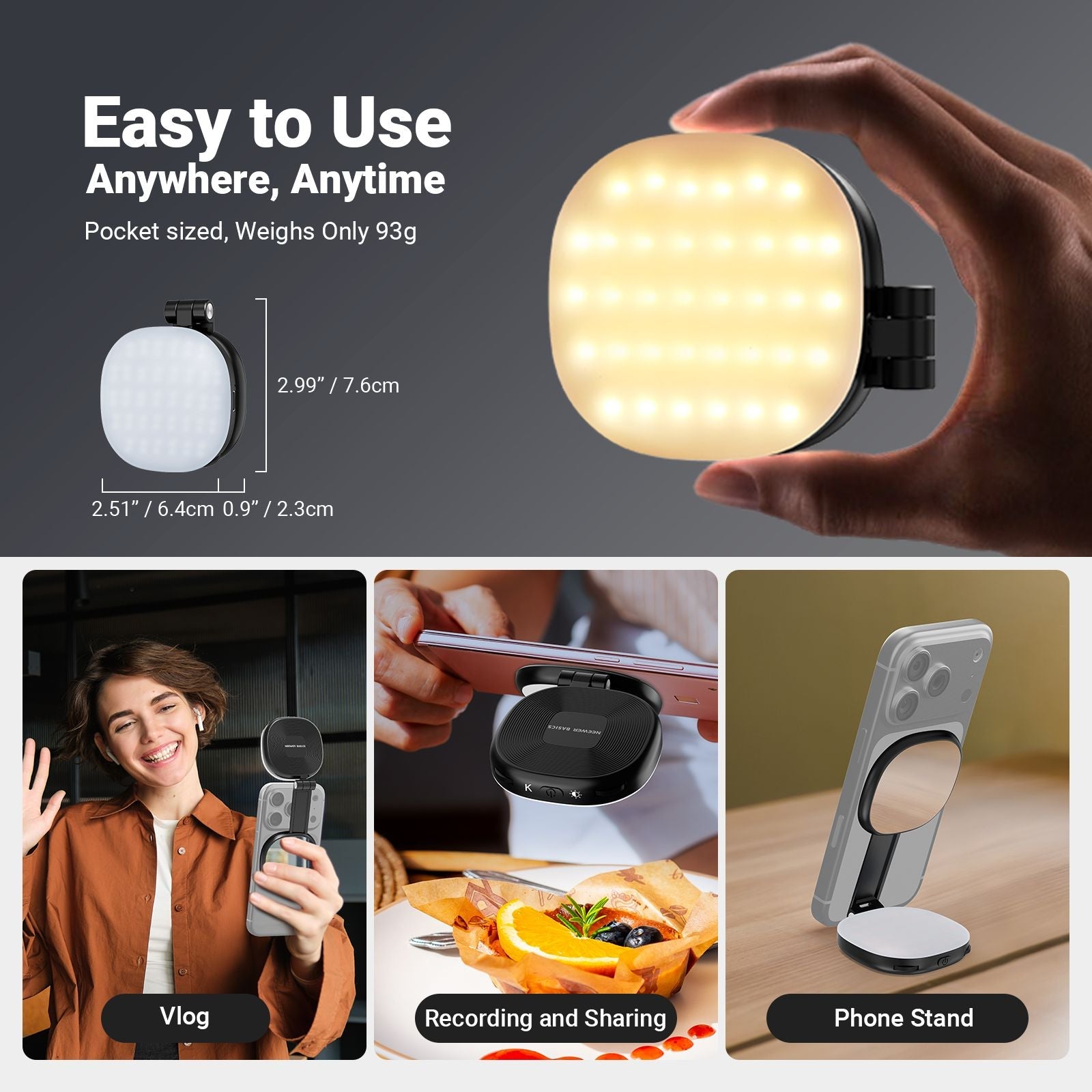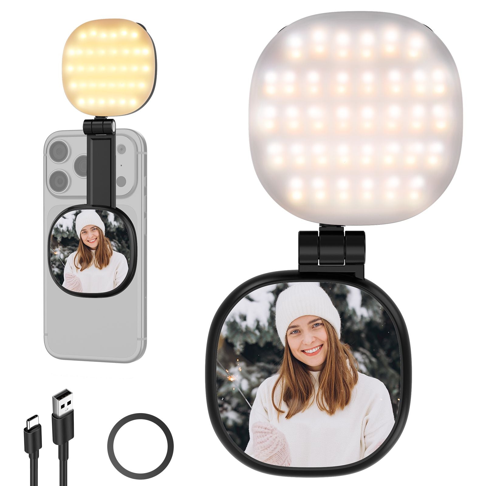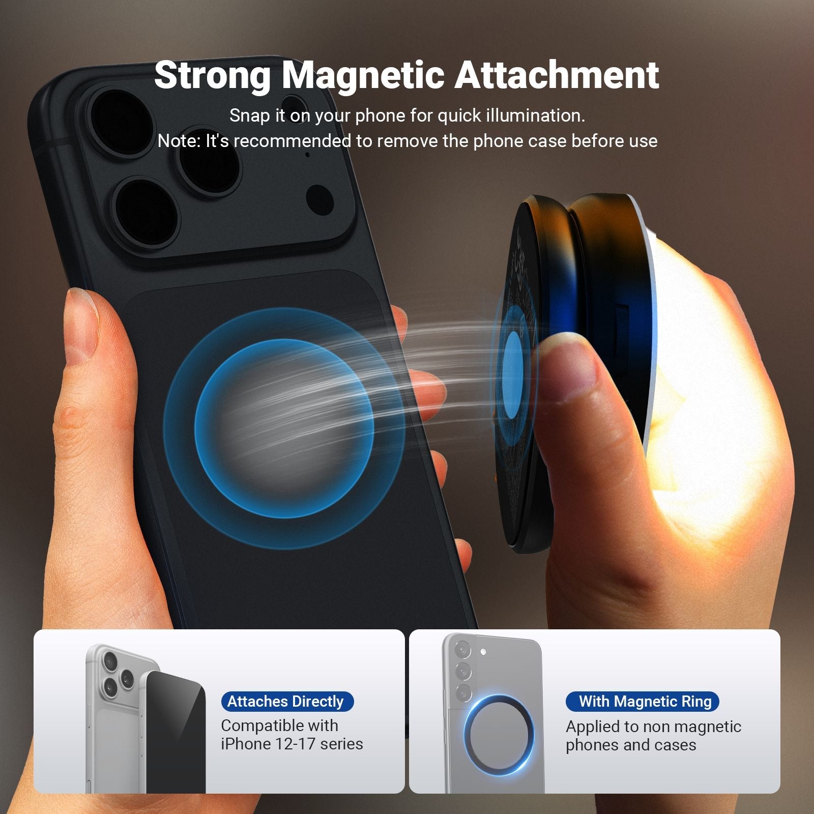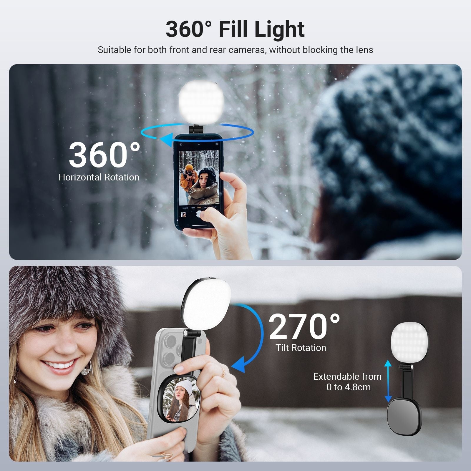 - Magnetic Design- The mini fill ringlight as photography phone picture light accessories is compatible with MagSafe iPhone 16 15 14 13 12 series iPad Pro, or nonmagnetic devices with the magnet ring. Rotates 360° and tilts 270° for front & rear camera use
