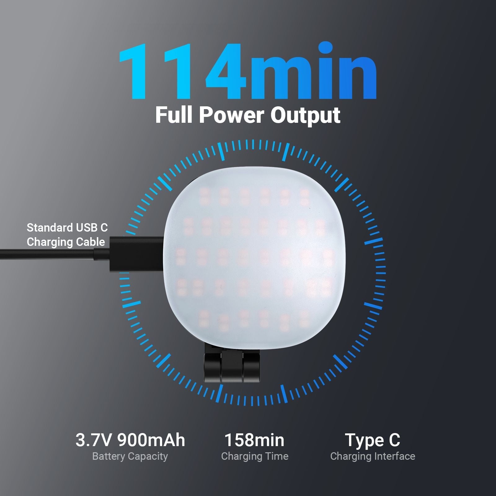 - Rechargeable Circle Halo Light- The 900mAh battery ensures up to 114min continuous lighting at full brightness and recharges via USB power sources like portable chargers. Photography phone ring light for selfie photos, films, travel video recording and others. NOTE: For optimal battery longevity, please fully charge the device before first use
