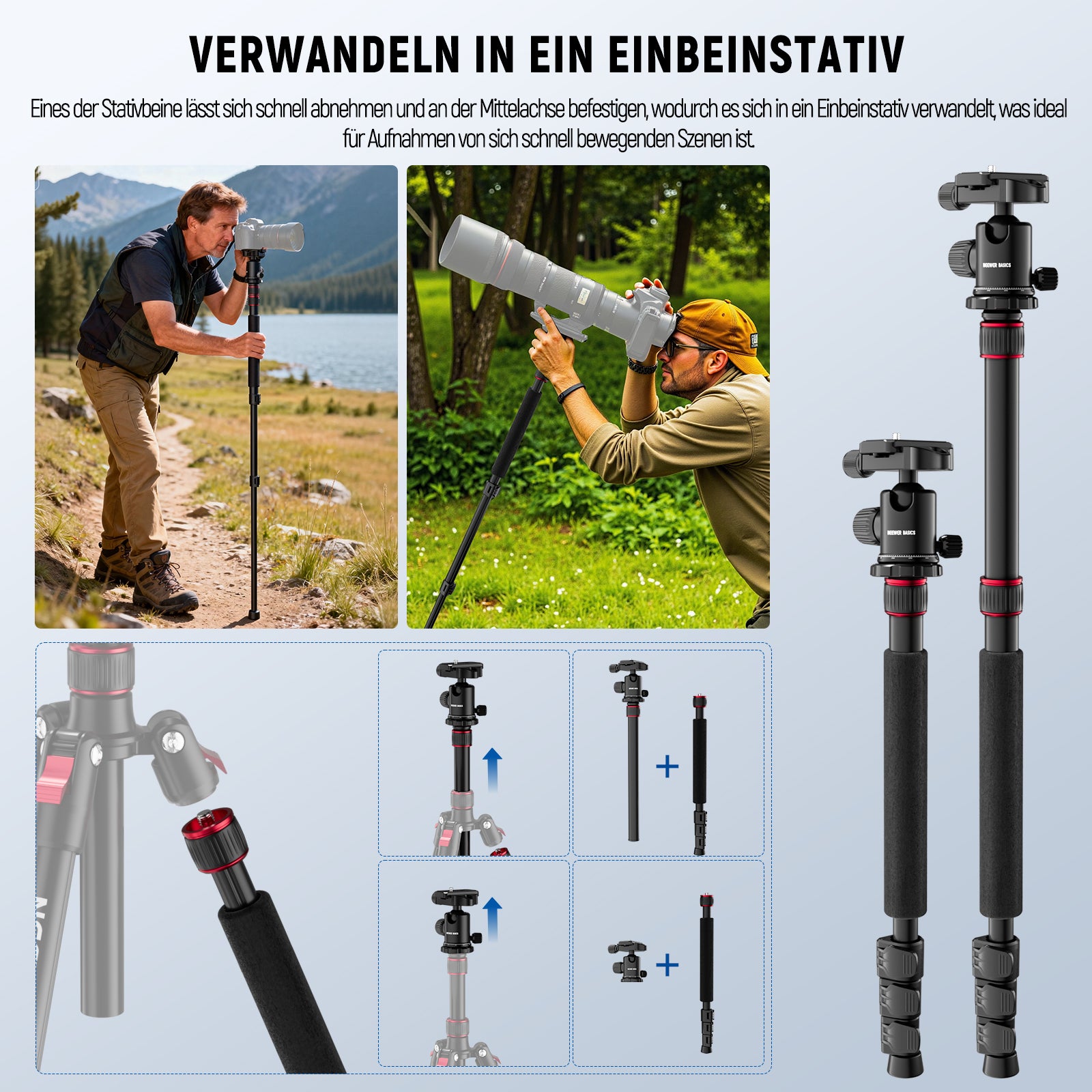 - Transform into a Monopod- One of the tripod leg tubes can be quickly disassembled and connected with the central axis to transform into a monopod, great for capturing quick, moving situations, versatile as a trekking pole during your hikes. The height of the monopod is adjustable from 31.5"/80 cm to 74.4"/189 cm. Ideal tri pod stand with phone holder attachment compatible with iPhone for content creator essential photography videography accessories, influencer must have camera creation gear