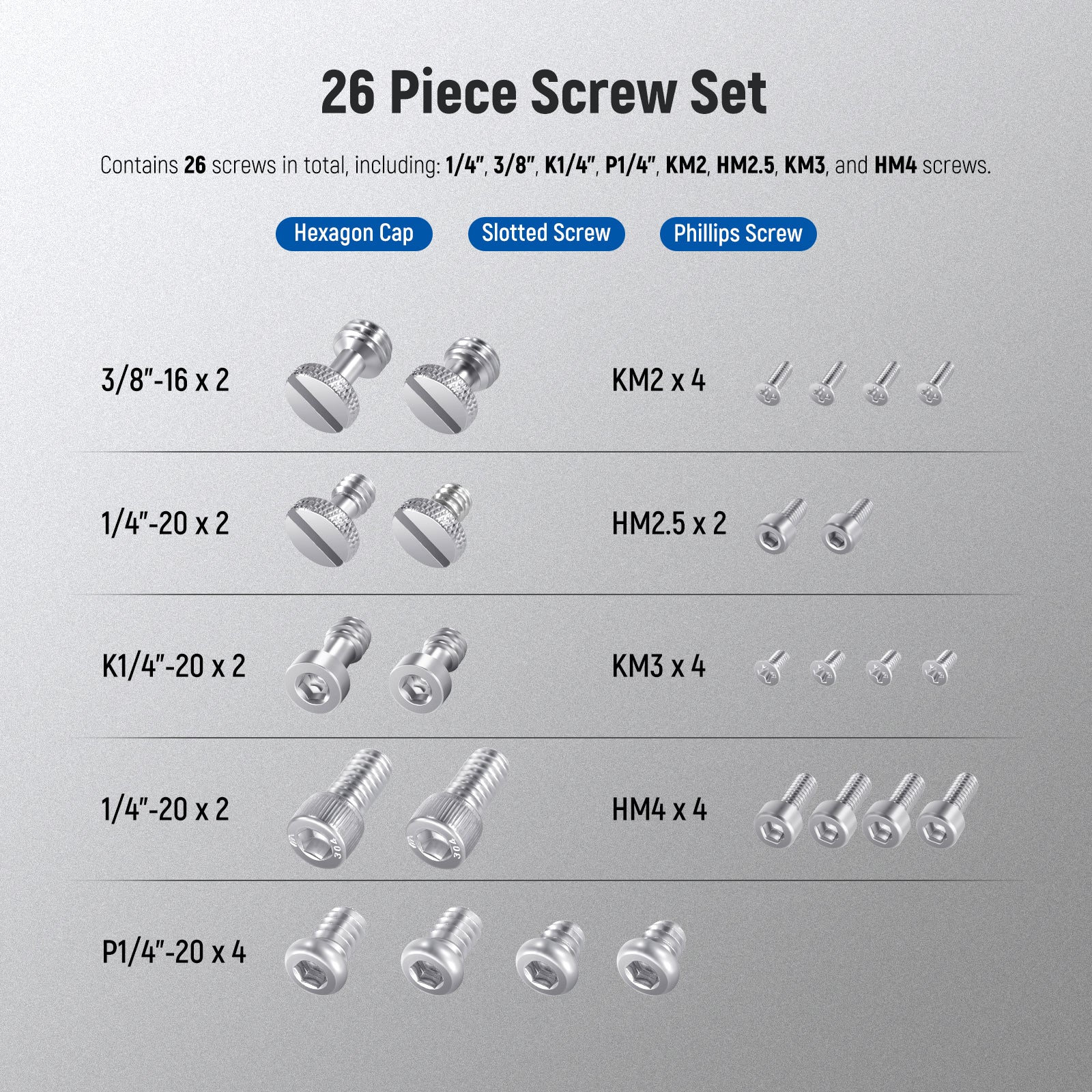 - Handy Photography Screw Set- Small camera accessories like screws get misplaced all the time. Get this camera mount screw set and always have spare screws at hand. Six kinds of screws included: 1/4", 3/8", M2, M2.5, M3, and M4 screws