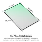 - HD Optical Glass Build- Built with HD optical glass, the filter delivers high clarity pictures without compromising image quality and minimizes reflections from the filter itself. This rectangular shape filter eliminates vignetting issues common to circular filters. No color cast